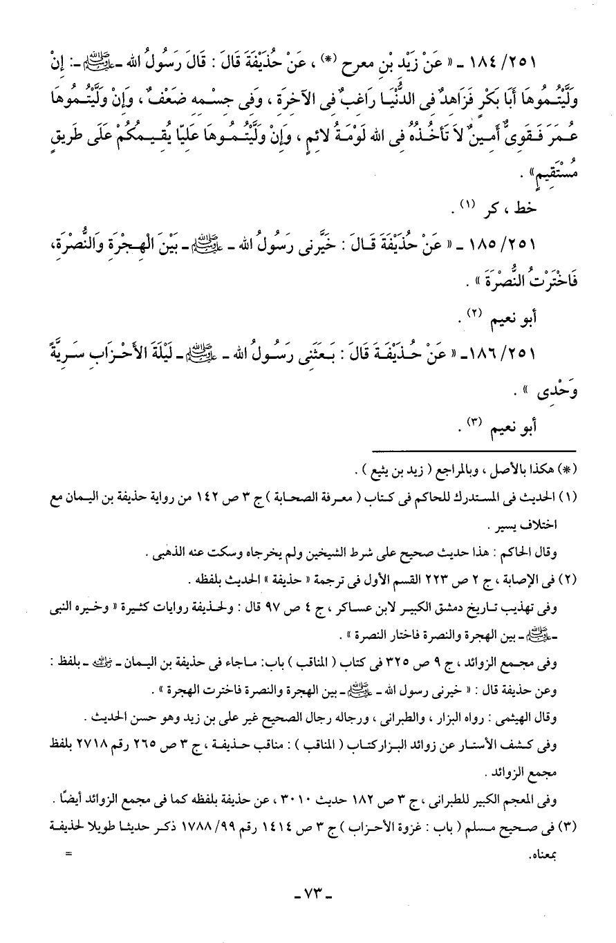 251/ 184 - "عَنْ زَيْد بْنِ معرح (*)، عَنْ حُذَيْفَةَ قَالَ: قَالَ رَسُولُ الله - صلى الله عليه وسلم -: إِنْ وَلَّيْتُمُوهَا أَبَا بَكْرٍ فَزَاهِدٌ فِى الدُّنْيَا رَاغِبٌ فِى الآخِرَةِ، وَفِى جِسْمِهِ ضَعْفٌ، وَإنْ وَلَّيْتُمُوهَا عُمَرَ فَقَوِىٌّ أَمِينٌ لَا تَأخُذُهُ فِى الله لَوْمَةُ لائِمٍ، وَإِنْ وَلَّيْتُمُوهَا عَلِيّا يُقِيمُكُمْ عَلَى طَريقٍ مُسْتَقِيمٍ".