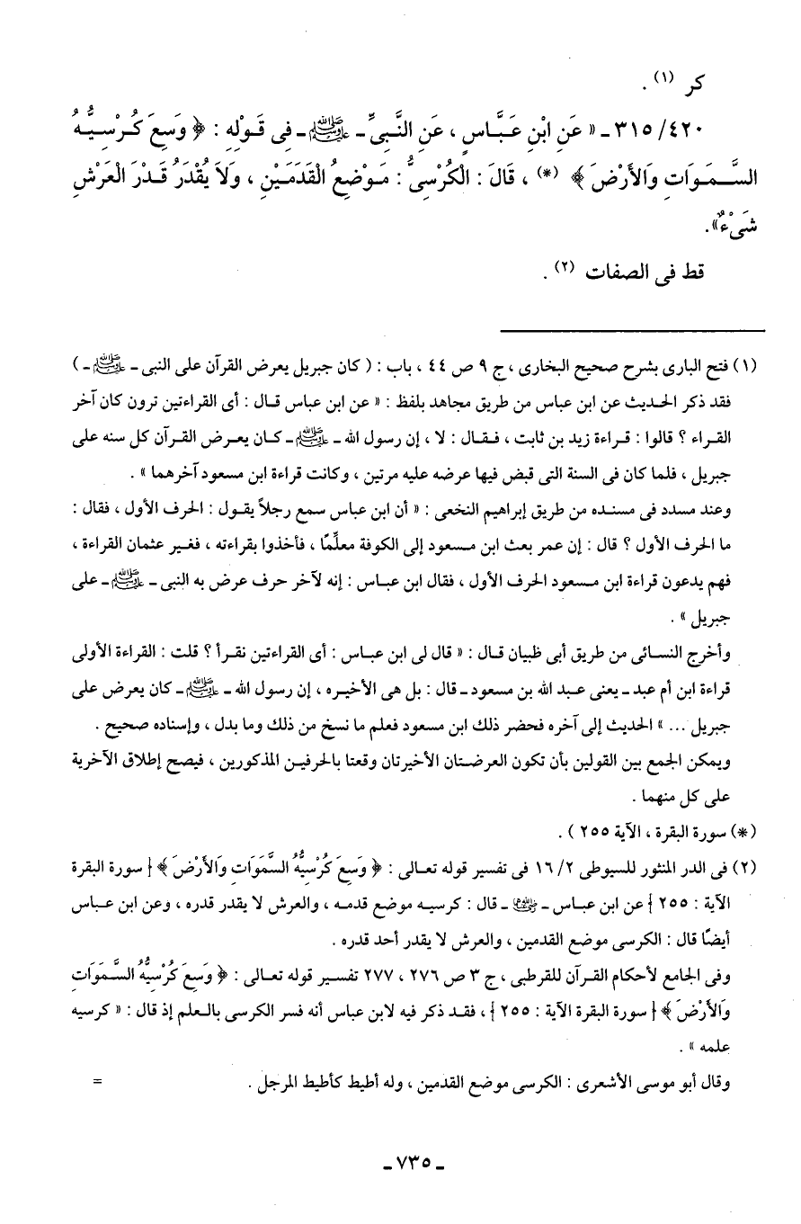 420/ 315 - "عَنِ ابْنِ عَبَّاسٍ، عَنِ النَّبِىَّ - صلى الله عليه وسلم - فِى قَوْلِهِ: {وَسِعَ كُرْسيُّهُ