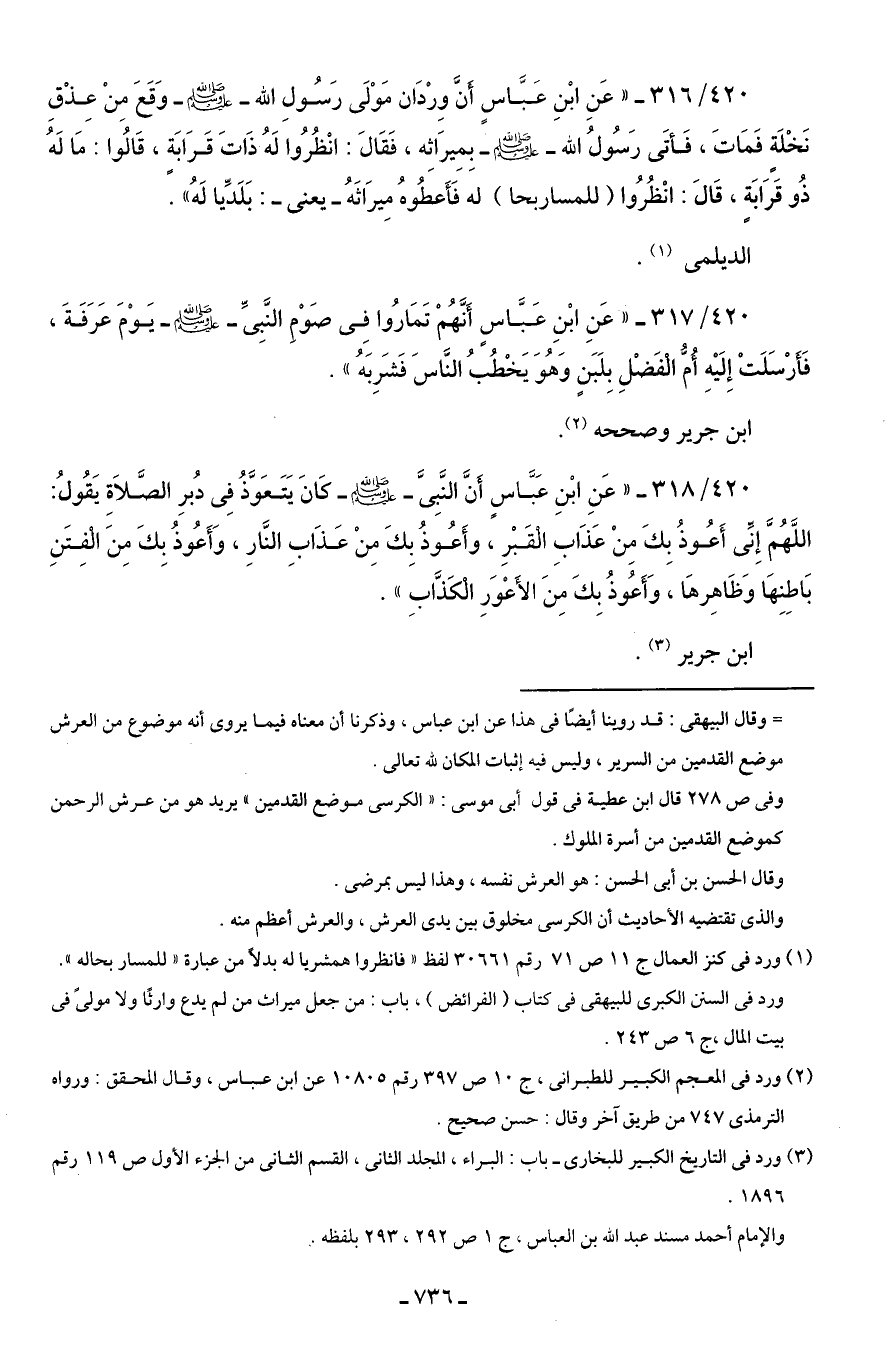 وفى ص 278 قال ابن عطية في قول أَبى موسى: "الكرسى موضع القدمين" يريد هو من عرش الرحمن كموضع القدمين من أسرة الملوك.