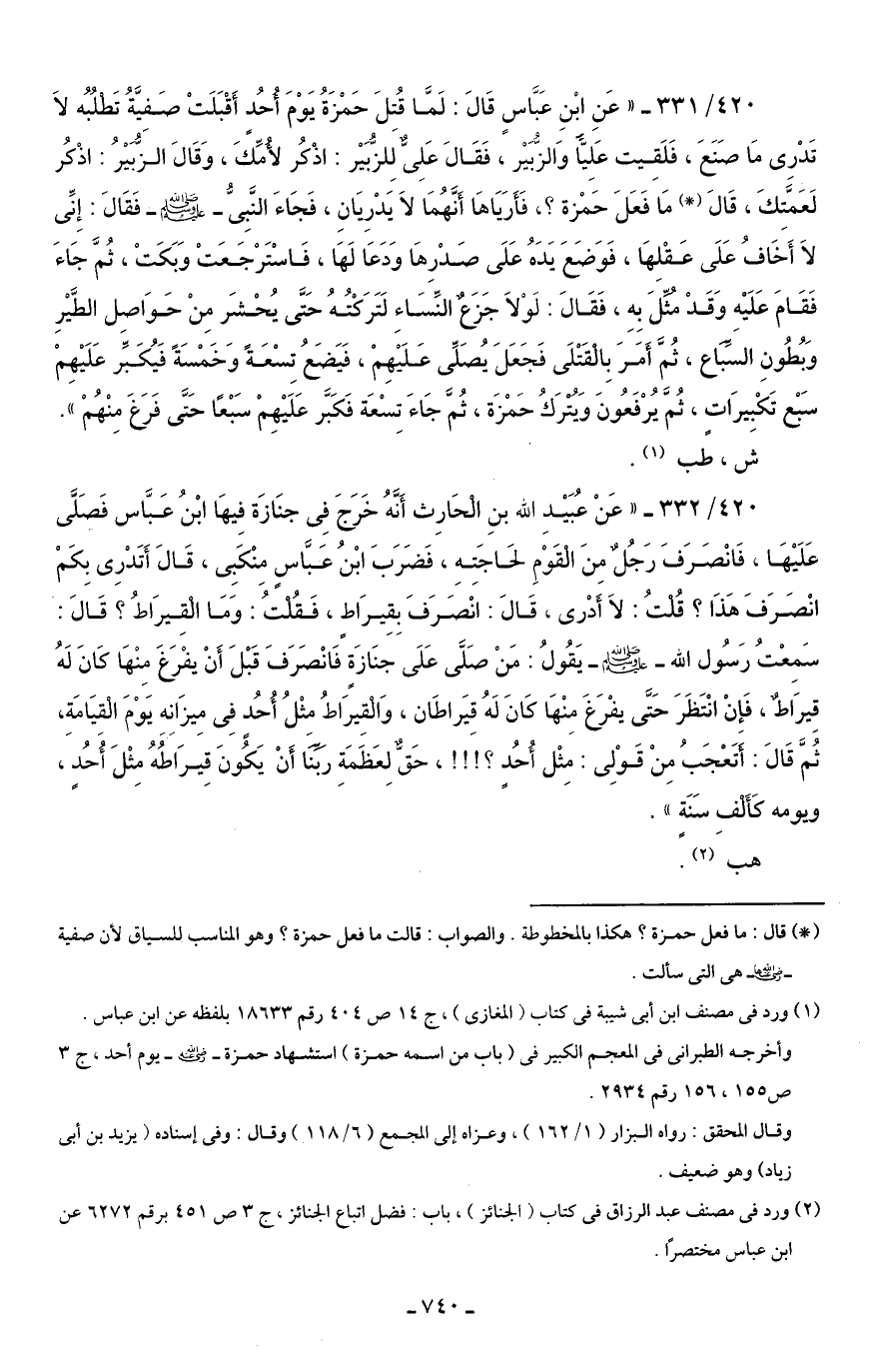 420/ 331 - "عَنِ ابْنِ عَبَّاسٍ قَالَ: لَمَّا قُتِلَ حَمْزَةُ يَوْمَ أُحُدٍ أَقْبَلَتْ صَفِيَّةُ تَطلُبُه لَا قَدْرِى مَا صَنَعَ، فَلَقِيت عَلِيًّا وَالزُّبَيْر، فَقَالَ عَلِىٌّ لِلزُّبَيْر: اذْكُر لأُمِّكً، وَقَالَ الزُّبَيْرُ: اذْكُر لَعَمَّتِكَ، قَالَ (*) مَا فَعَلَ حَمْزة؟ ، فَأَرَيَاهَا أَنَّهُمَا لَا يَدْرِيَانِ، فَجَاءَ النَّبِىُّ - صلى الله عليه وسلم - فَقَالَ: إِنِّى لَا أَخَافُ عَلَى عَقْلِهَا، فَوَضَعَ يَدَهُ عَلَى صَدْرِهَا وَدَعَا لَهَا، فَاسْتَرْجَعَتْ وَبَكَتْ، ثُمَّ جَاءَ فَقَامَ عَلَيْهِ وَقَدْ مُثِّلَ بِهِ، فَقَالَ: لَوْلَا جَزَعٌ النِّسَاءِ لَتَرَكْتُهُ حَتَّى يُحْشَر مِنْ حَوَاصل الطَّيْرِ وَبُطُونِ السِّبَاع، ثُمَّ أَمَرَ بِالقَتْلَى فَجَعَلَ يُصَلِّى عَلَيْهِمْ، فَيَضَعُ تِسْعَةً وَخَمْسَةً فَيُكَبِّر عَلَيْهِمْ سَبْعْ تَكْبِيرَاتٍ، ثُمَّ يُرْفَعُونَ وَيُتَرَكُ حَمْزَة، ثُمَّ جَاءَ تِسْعَة فَكَبَّر عَلَيْهِمْ سَبْعًا حَتَّى فَرَغَ مِنْهُمْ".