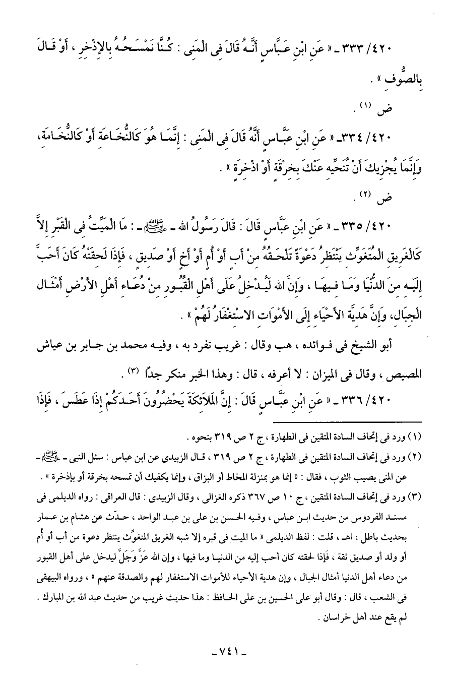 420/ 336 - "عَنِ ابْنِ عَبَّاسٍ قَالَ: إِنَّ المَلَائِكَةَ يَحْضُرُونَ أَحَدَكُمْ إِذَا عَطَسَ، فَإِذَا