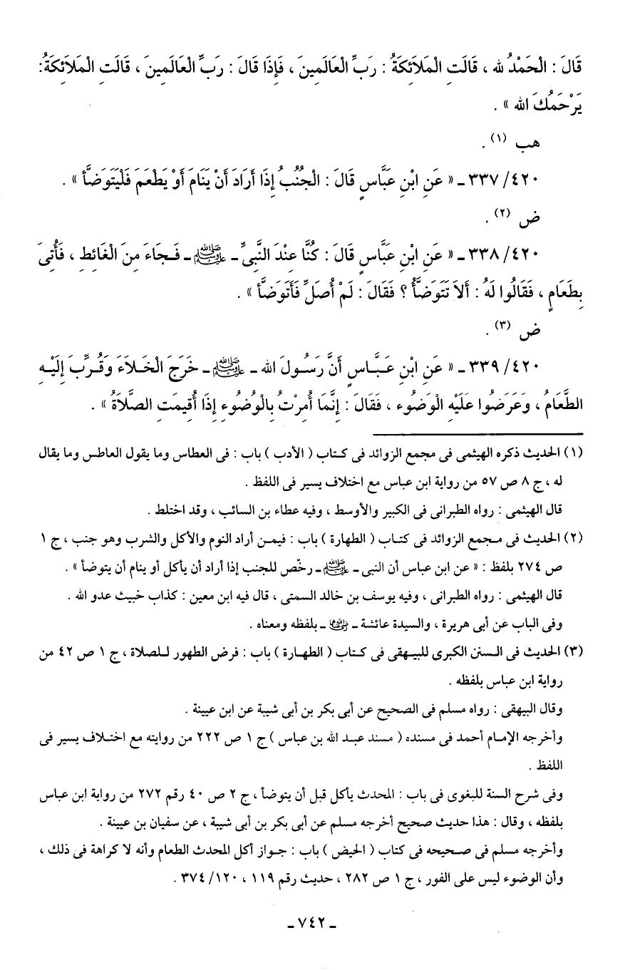 420/ 337 - "عَنِ ابْنِ عَبَّاسٍ قَالَ: الجُنُبُ إِذَا أَرَادَ أَنْ يَنَامَ أَوْ يَطعَمَ فَليَتَوَضَّأ".