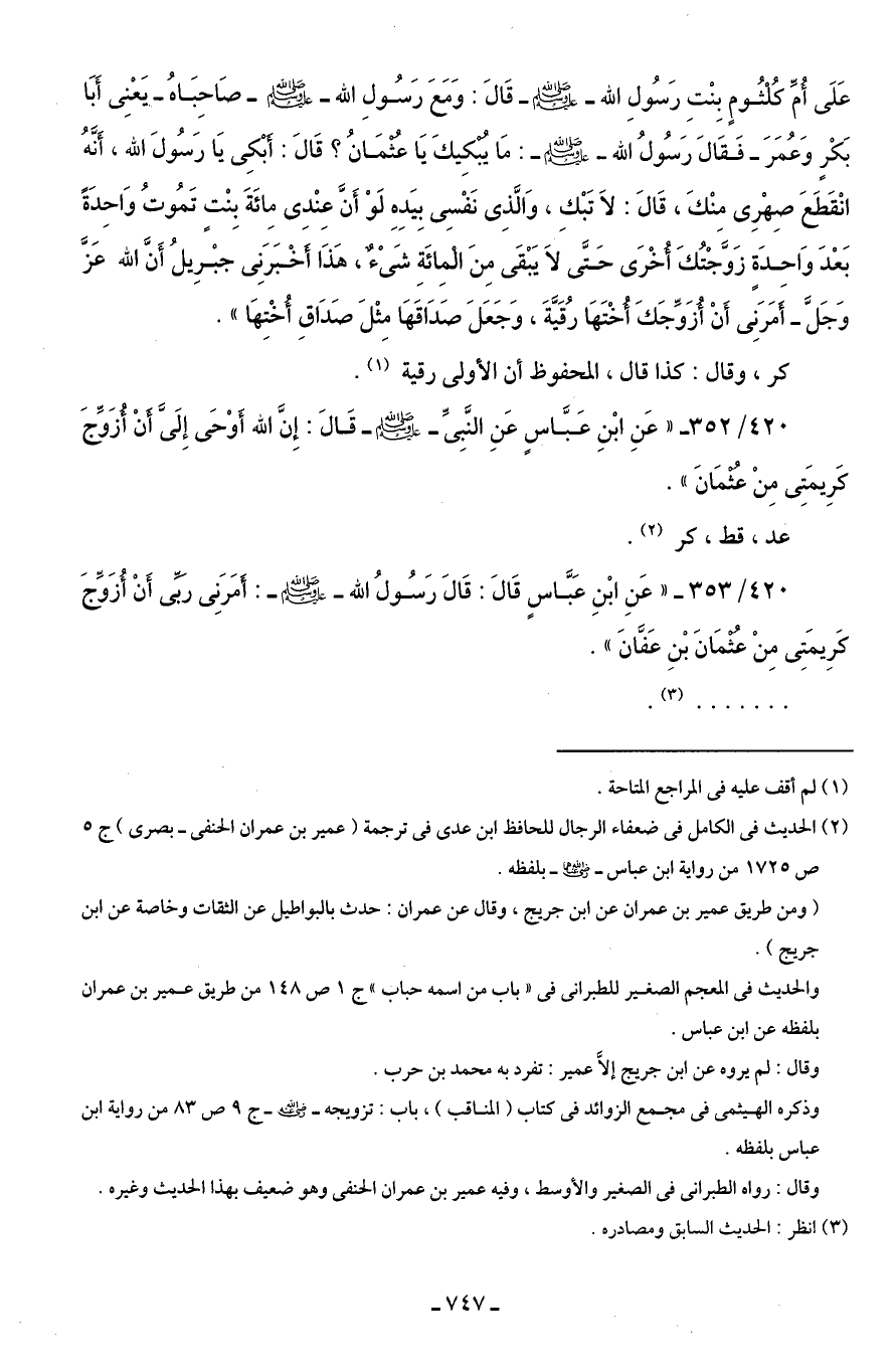 420/ 352 - "عَنِ ابْنِ عَبَّاسٍ عَنِ النَّبِىِّ - صلى الله عليه وسلم - قَالَ: إِنَّ الله أَوْحَى إِلَىَّ أَنْ أُزَوِّجَ كَرِيمَتِى مِنْ عثمَانَ".