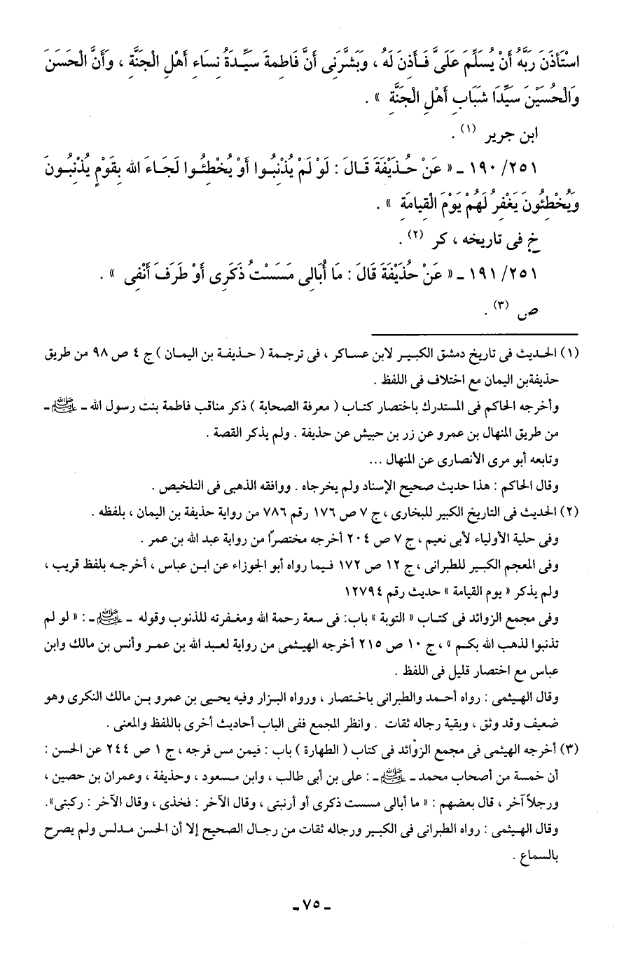 251/ 190 - "عَنْ حُذَيْفَةَ قَالَ: لَوْ لَمْ يُذْنِبُوا أَوْ يُخْطِئُوا لَجَاءَ الله بِقَوْمٍ يُذْنِبُونَ وَيُخْطِئُونَ يَغْفِرُ لَهُمْ يَوْمَ الْقِيامَةِ".
