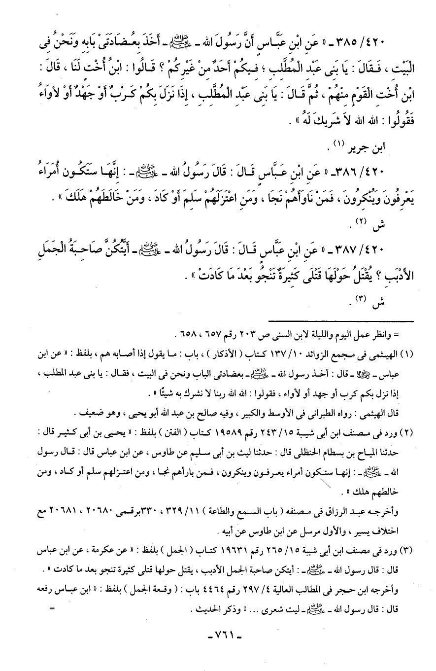 420/ 387 - "عَنِ ابْنِ عَبَّاسٍ قَالَ: قَالَ رَسُولُ الله - صلى الله عليه وسلم - أيَّتُكُنَّ صَاحِبَةُ الجَمَلِ الأدْبَبِ؟ يُقْتَلُ حَوْلَهَا قَتْلَى كثِيرَةٌ تَنْجُو بَعْدَ مَا كَادَتْ".