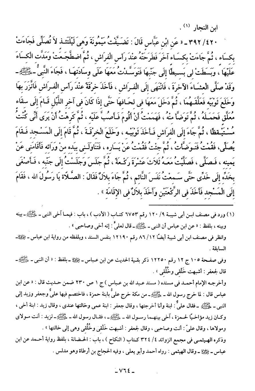 420/ 392 - "عَنِ ابْنِ عَبَّاسٍ قَالَ: تَضَيَّفْتُ مَيْمُونَةَ وَهِىَ لَيْلَتَئذ لاَ تُصَلِّى فَجَاءَتْ بِكِسَاءٍ، ثُمَّ جَاءَتْ بِكسَاءٍ آخَرَ فَطَرَحَتْهُ عِنْدَ رَأسِ الفِرَاشِ، ثُمَّ اضطَّجَعَتْ وَمَدَّتِ الكسَاءَ عَلَيْهَا، وَبَسَطَتْ لِى بَسَيطًا إِلَى جَنْبِهَا فَتَوَسَّدْتُ مَعَهَا عَلَى وِسَادَتِهَا، فَجَاءَ النَّبِىُّ - صلى الله عليه وسلم - وَقَدْ صَلَّى العِشَاءَ الآخِرَةَ، فَانْتَهَى إِلَى الفِرَاشِ، فَأخَذَ خِرْقَةً عِنْدَ رَأسِ الفِرَاشِ فَاتَّزَرَ بِهَا وَخَلَعَ ثَوْبَيْهِ فَعَلَّقَهُمَا، ثُمَّ دَخَلَ مَعَهَا فِى لِحَافِهَا حَتَّى إِذَا كَانَ فِى آخِرِ اللَّيْلِ قَامَ إِلَى سِقَاءٍ مُعَلَّقٍ فَحَمَلَهُ، ثُمَّ تَوَضَّأ منْهُ، فَهَمَمْتُ أنْ أَقُومَ فَأصُبَّ عَلَيْهِ، ثُمَّ كرِهْتُ أنْ يَرَى أَنِّى كُنْتُ مُسْتَيْقظًا، ثُمَّ جَاءَ إِلَى الفِرَاشِ فَأَخَذَ ثَوْبَيْهِ، وَخَلَعَ الخِرْقَةَ، ثُمَّ قَامَ إِلَى المَسْجِدِ فَقَامَ يُصَلِّى، فَقُمْتُ فَتَوَضَّأتُ، ثُمَّ جِئْتُ فَقُمْتُ عَنْ يَسَارِهِ، فَتَنَاوَلَنِى بِيَدِهِ مِنْ وَرَائِهِ فَأَقَامَنِى عَنْ يَمِينه، فَصَلَّى، فَصَلَّيْتُ مَعَهُ ثَلاَثَ عَشْرَةَ رَكْعَةً، ثُمَّ جَلَسَ وَجَلَسْتُ إِلَى جَنْبِهِ، فَأَصْغَى بِخَدِّهَ إِلَى خَدِّى حَتَّى سَمِعْتُ نَفَسَ النَّائِم، ثُمَّ جَاءَ بِلاَلٌ فَقَالَ: الصَّلَاة يَا رَسُولَ الله، فَقَامَ إِلَى المَسْجِدِ فَأخَذَ فِى الرَّكعَتَيْنِ وَأَخَذَ بِلاَلٌ فِى الإِقَامَةِ".