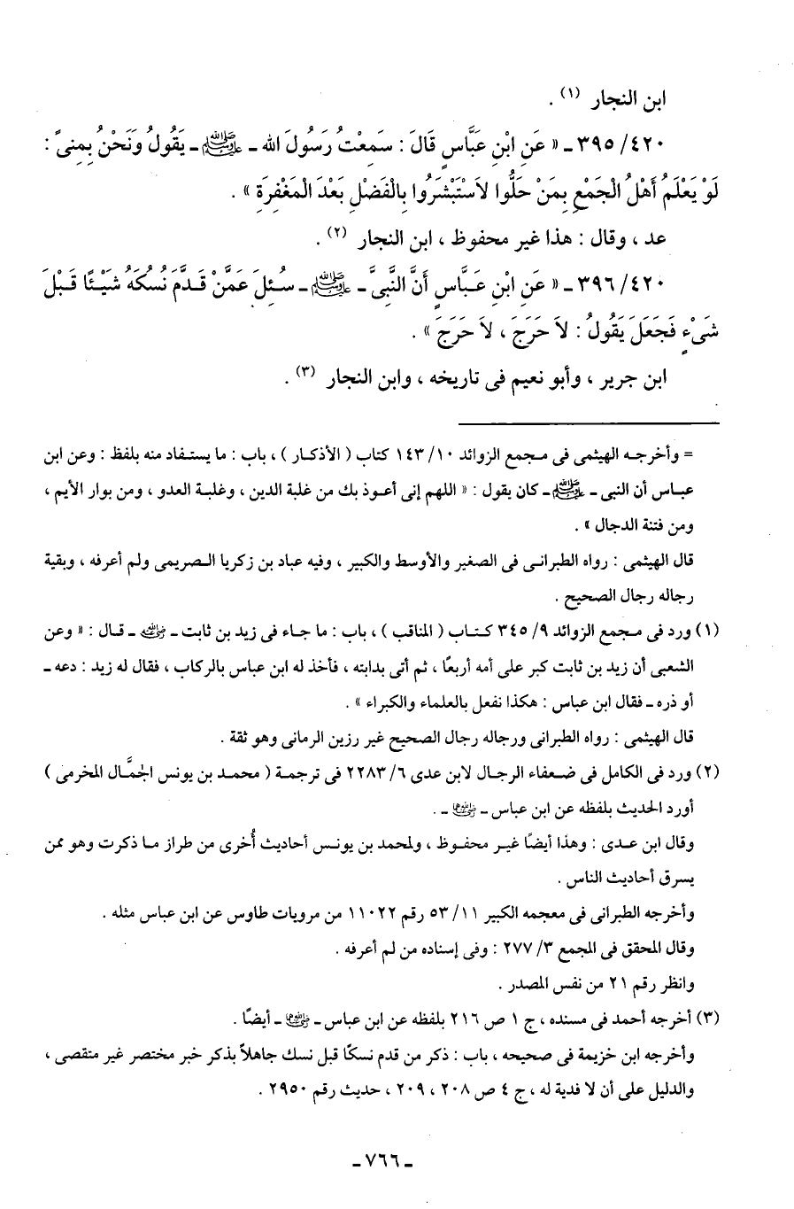 420/ 395 - "عَنِ ابْنِ عَبَّاسٍ قَالَ: سَمعْتُ رَسُولَ الله - صلى الله عليه وسلم - يَقُولُ وَنَحْنُ بِمِنىً: لَوْ يَعْلَمُ أَهْلُ الجَمعْ بِمَنْ حَلُّوا لاَسْتَبْشَرُوا بِالْفَضلِ بَعْدَ المَغْفِرَةِ".