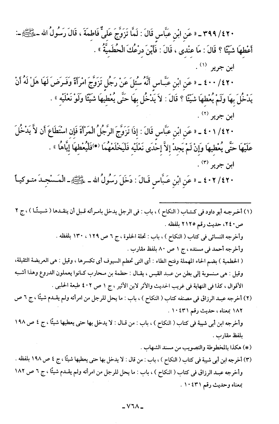 420/ 401 - "عَنِ ابْنِ عَبَّاسٍ قَالَ: إِذَا تَزَوَّجَ الرَّجُلُ المَرْأَةَ فَإنِ اسْتَطَاعَ أَن لاَّ يَدْخُلَ عَلَيْهَا حَتَّى يُعْطِيهَا وَإِنْ لَمْ يَجِدْ إِلاَّ إِحْدَى نَعْلَيْهِ فَليَخْلَعْهُمَا (، ) فَليُعْطِهَا إِيَّاهُا".