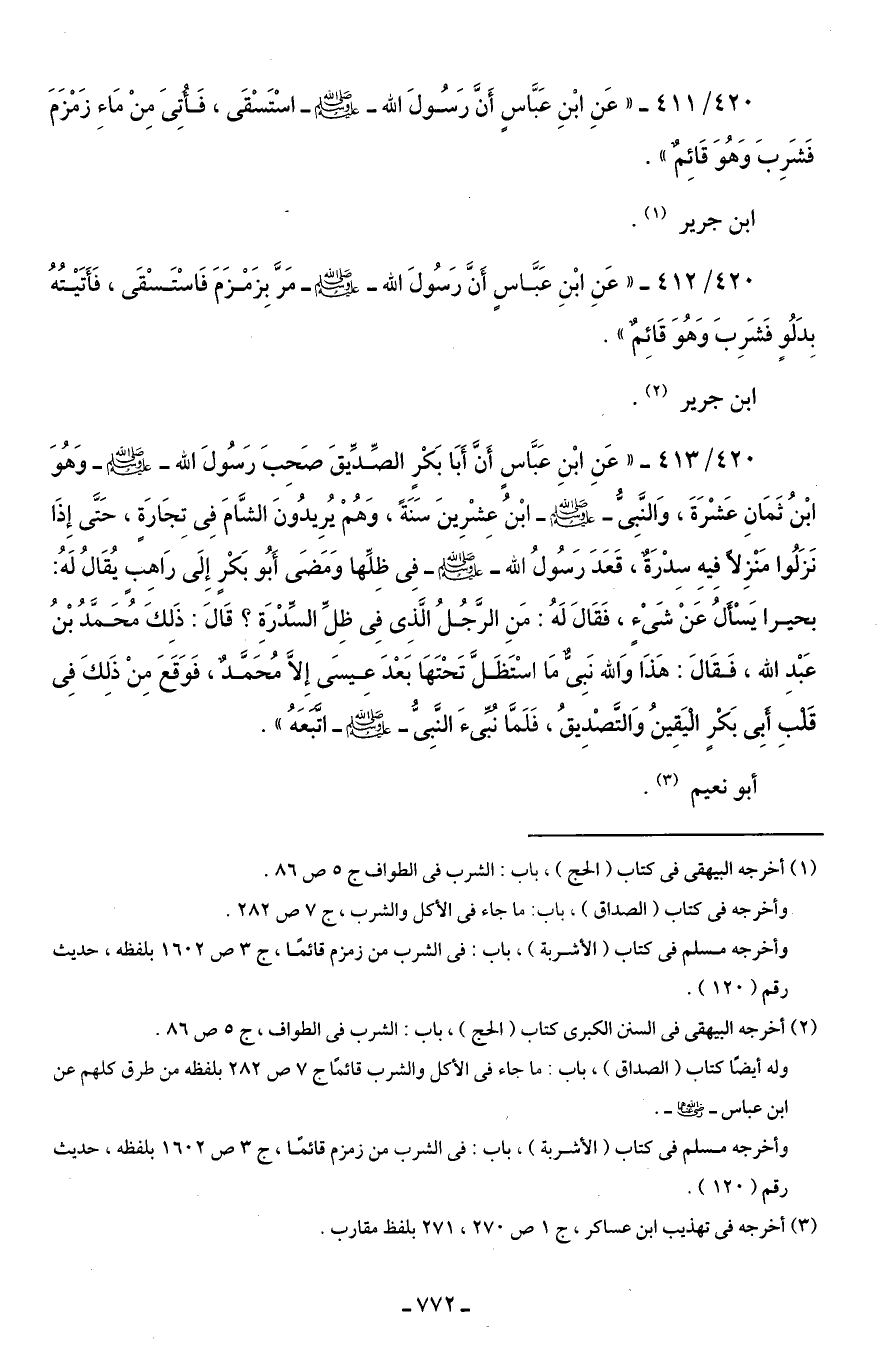 420/ 412 - "عَنِ ابْنِ عَبَّاسٍ أَنَّ رَسُولَ الله - صلى الله عليه وسلم - مَرَّ بِزَمْزَمَ فَاسْتَسْقَى، فَأَتَيْتُهُ بِدَلُوٍ فَشَرِبَ وَهُوَ قَائِمٌ".
