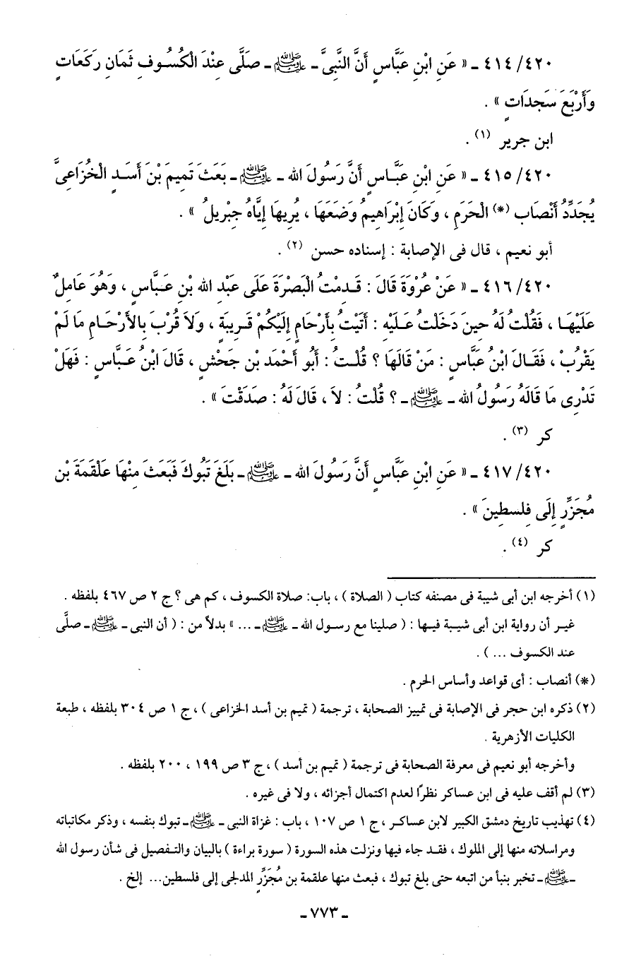 420/ 414 - "عَنِ ابْنِ عَبَّاسٍ أَنَّ النَّبِىَّ - صلى الله عليه وسلم - صَلَّى عِنْدَ الكُسُوفِ ثَمَانِ رَكَعَاتٍ وَأَرْبَعَ سَجدَاتٍ".