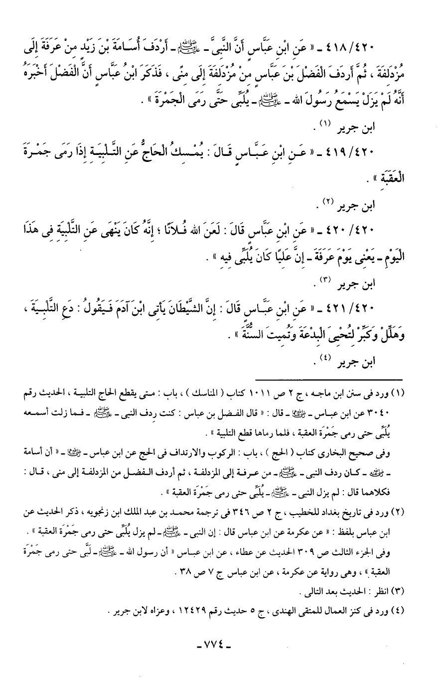 420/ 419 - "عَنِ ابْنِ عَبَّاسٍ قَالَ: يُمْسِكُ الحَاجُّ عَنِ التَّلْبِيَةِ إِذَا رَمَى جَمْرَةَ العَقَبَةِ".