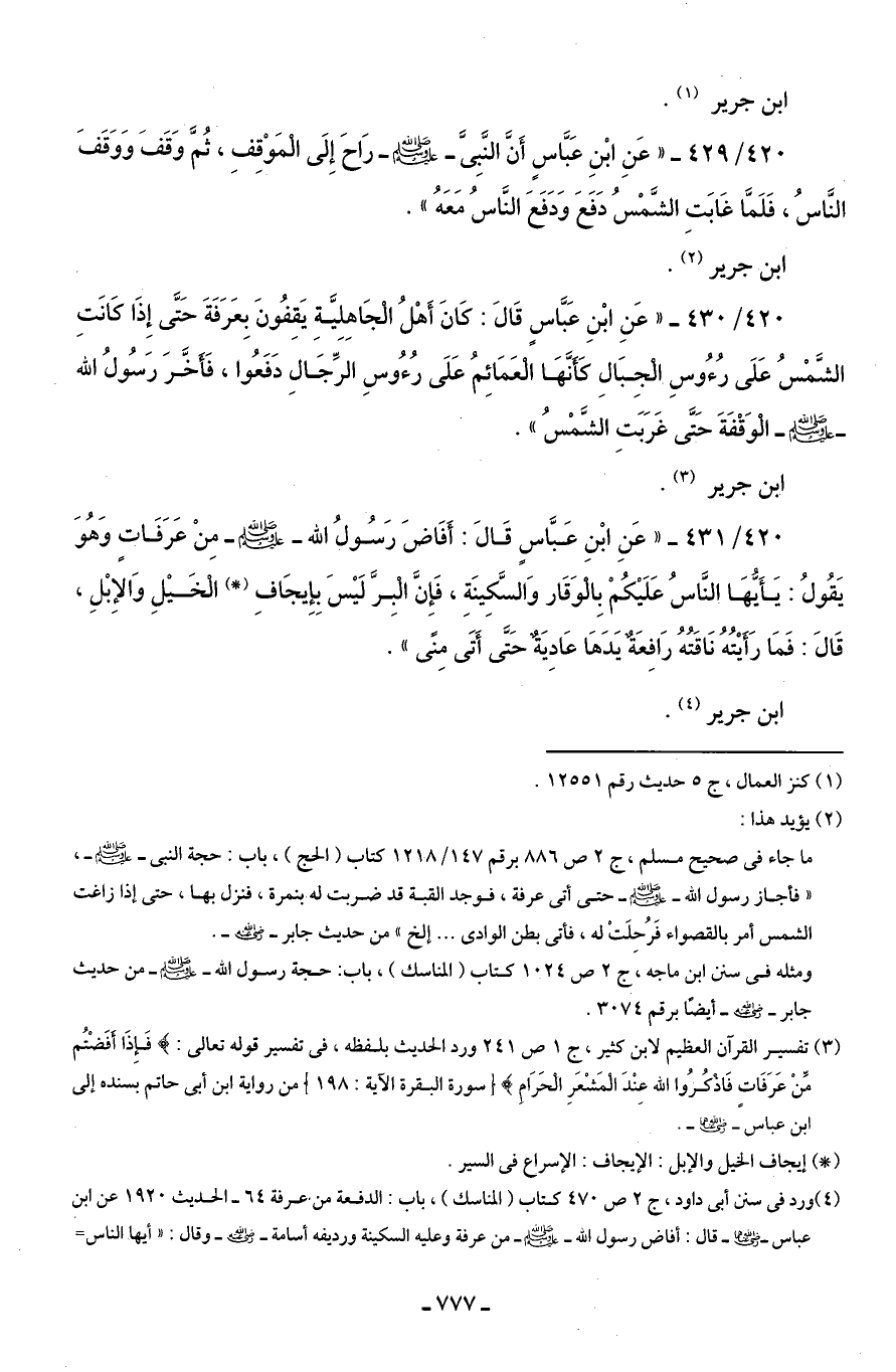 420/ 431 - "عَنِ ابْنِ عَبَّاسٍ قَالَ: أَفَاضَ رَسُولُ الله - صلى الله عليه وسلم - مِنْ عَرَفَاتٍ وَهُوَ يَقُولُ: يَأَيُّهَا النَّاسُ عَلَيْكُمْ بِالْوَقَار وَالسَّكِينَةِ، فَإِنَّ البِرَّ لَيْسَ بِإِيجَافِ (*) الْخَيْلِ وَالإِبْلِ، قَالَ: فَمَا رَأَيْتُهُ نَاقَتُهُ رَافِعَةٌ يَدَهَا عَادِيَةٌ حَتَّى أَتَى مِنًى".