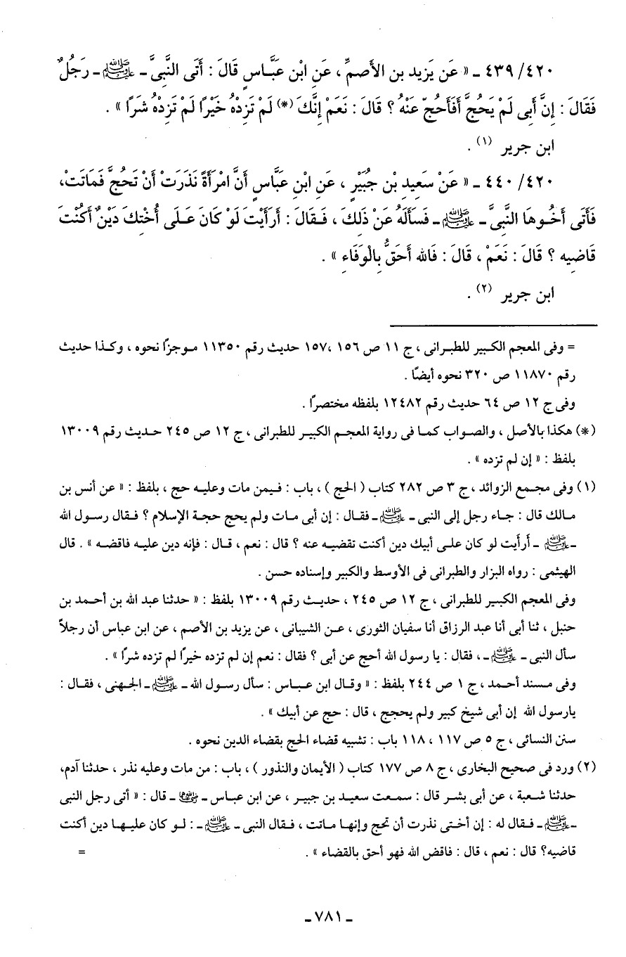 420/ 440 - "عَنْ سَعِيدِ بْن جُبَيْرٍ، عَنِ ابْنِ عَبَّاسٍ أَنَّ امْرَاةً نَذَرَتْ أَنْ تَحُجَّ فَمَاتَتْ، فَأَتَى أَخُوهَا النَّبِىَّ - صلى الله عليه وسلم -، فَسَأَلَهُ عَنْ ذَلكَ، فَقَالَ: أَرَأَيْتَ لَوْ كانَ عَلَى أُخْتِكَ دَيْنٌ أَكنتَ قَاضِيه؟ قَالَ: نَعَمْ، قَالَ: فَالله أَحَقُ بِالْوفَاءِ".