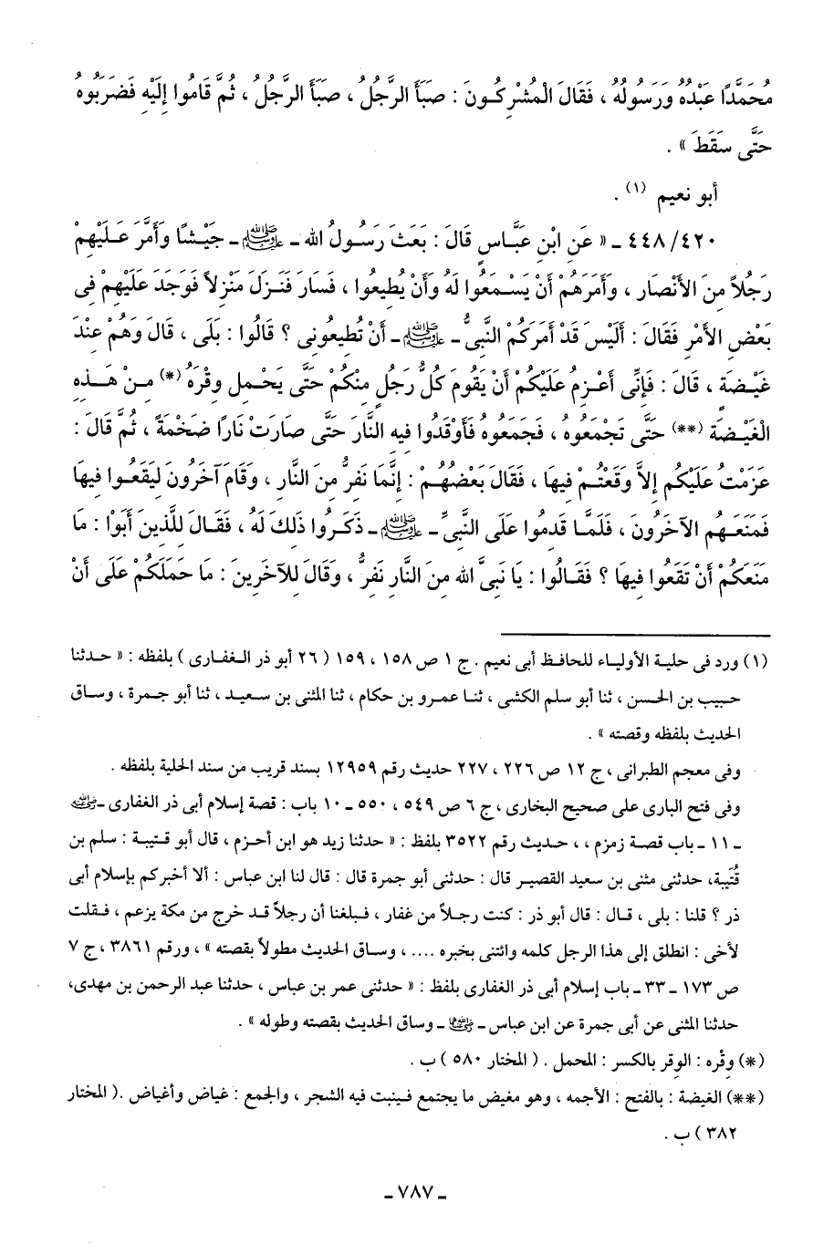 420/ 448 - "عَنِ ابْنِ عَبَّاسٍ قَالَ: بَعَثَ رَسُولُ الله - صلى الله عليه وسلم - جَيْشًا وَأَمَّرَ عَلَيْهِمْ رَجُلًا مِنَ الأَنْصَار، وَأَمَرَهُمْ أَنْ يَسْمَعُوا لَهُ وَأَنْ يُطِيعُوا، فَسَارَ فَنَزَلَ مَنْزِلًا فَوَجَدَ عَلَيْهِمْ فِي بَعْضِ الأَمْرِ فَقَالَ: أَلَيْسَ قَدْ أَمَرَكُمْ النَّبِيُّ - صلى الله عليه وسلم - أَنْ تُطِيعُونِي؟ قَالُوا: بَلَي، قَالَ وَهُمْ عِنْدَ غَيْضَةٍ، قَالَ: فَإنِّي أَعْزِمُ عَلَيْكُمْ أَنْ يَقُومَ كُل رَجُلٍ مِنْكُمْ حَتَّى يَحْمِل وِقْرَهُ (*) مِنْ هَذِهِ الْغَيْضَة (* *) حَتَّى تَجْمَعُوهُ، فَجَمَعُوهُ فَأَوْقَدُوا فِيه النَّارَ حَتَّى صَارَتْ نَارًا ضَخْمَةً، ثُمَّ قَالَ: عَزَمْتُ عَلَيْكُم إِلَّا وَقَعْتُمْ فِيهَا، فَقَالَ بَعْضُهُمْ: إِنَّمَا نَفِرُ مِنَ النَّارِ، وَقَامَ آخَرُونَ لِيَقَعُوا فِيهَا فَمَنَعَهُم الآخَرُونَ، فَلَمَّا قَدِمُوا عَلَى النَّبِيِّ - صلى الله عليه وسلم - ذَكَرُوا ذَلِكَ لَهُ، فَقَالَ لِلَّذِينَ أَبَوْا: مَا مَنَعَكُمْ أَنْ تَقَعُوا فِيهَا؟ فَقَالُوا: يَا نَبِيَّ الله مِنَ النَّارِ نَفِرُّ، وَقَالَ لِلآخَرِينَ: مَا حَمَلَكُمْ عَلَى أَنْ