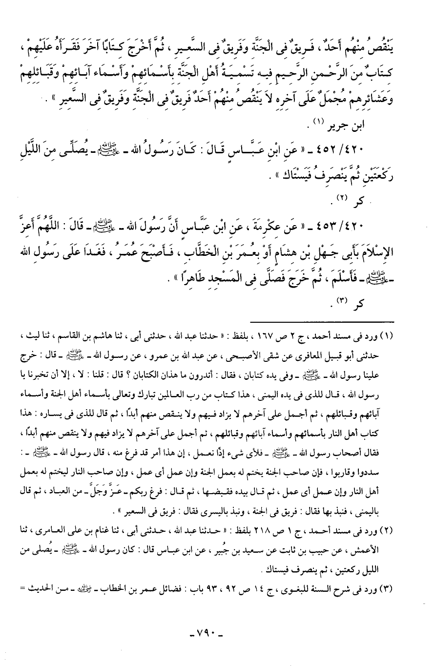 (¬1) ورد في مسند أحمد، ج 2 ص 167، بلفظ: "حدثنا عبد الله، حدثني أبي، ثنا هاشم بن القاسم، ثنا ليث، حدثني أبو قبيل المعافري عن شقي الأصبحي، عن عبد الله بن عمرو، عن رسول الله - صلى الله عليه وسلم - قال: خرج علينا رسول الله - صلى الله عليه وسلم - وفي يده كتابان، فقال: أتدرون ما هذان الكتابان؟ قال: قلنا: لا، إلا أن تخبرنا يا رسول الله، قال للذي في يده اليمني، هذا كتاب من رب العالمين تبارك وتعالى بأسماء أهل الجنة وأسماء آبائهم وقبائلهم، ثم أجمل علي آخرهم لا يزاد فيهم ولا ينقص منهم أبدًا، ثم قال للذي في يساره: هذا كتاب أهل النار بأسمائهم وأسماء آبائهم وقبائلهم، ثم أجمل علي آخرهم لا يزاد فيهم ولا ينقص منهم أبدًا، فقال أصحاب رسول الله - صلى الله عليه وسلم - فلأي شيء إذًا نعمل، إن هذا أمر قد فرغ منه، قال رسول الله - صلى الله عليه وسلم -: سددوا وقاربوا، فإن صاحب الجنة يختم له بعمل الجنة وإن عمل أي عمل، وإن صاحب النار ليختم له بعمل أهل النار وإن عمل أي عمل، ثم قال بيده فقبضها، ثم قال: فرغ ربكم - عَزَّ وَجَلَّ - من العباد، ثم قال باليمني، فنبذ بها فقال: فريق في الجنة، ونبذ باليسرى فقال: فريق في السعير".