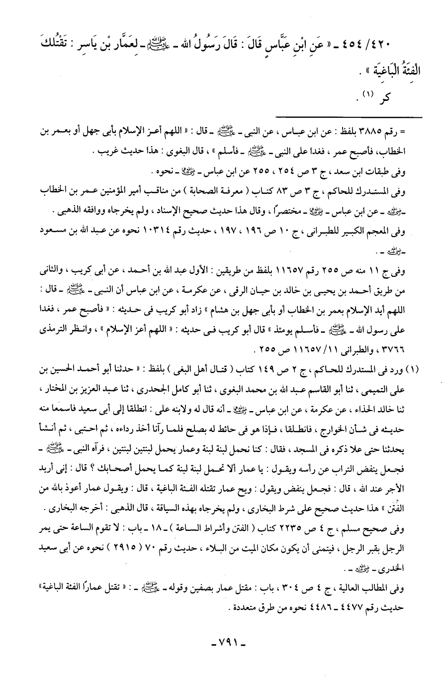 420/ 454 - "عَنِ ابْنِ عَبَّاسٍ قَالَ: قَالَ رَسُولُ الله - صلى الله عليه وسلم - لِعَمَّار بْن يَاسِر: تَقْتُلكَ الْفِئَةُ الْبَاغِيَة".