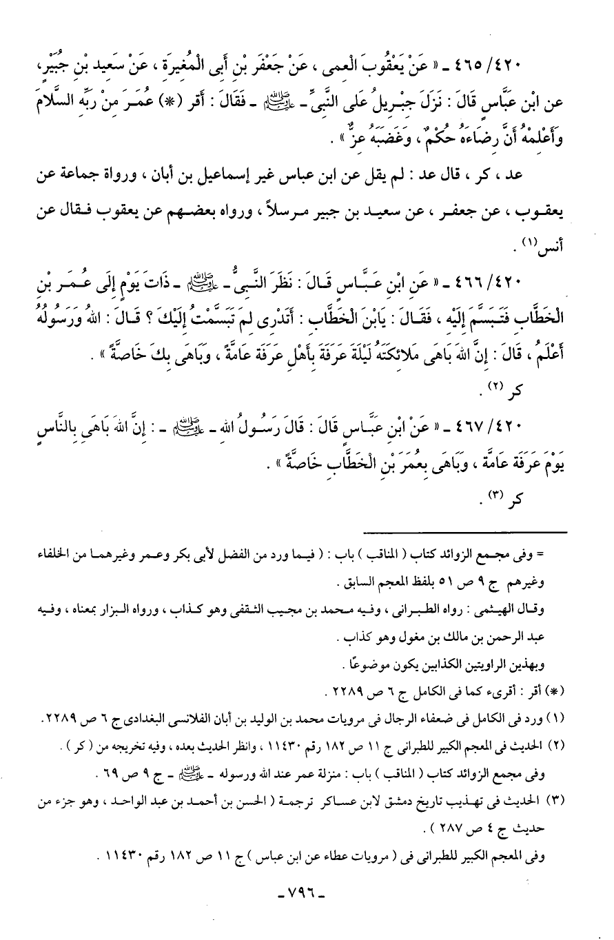 420/ 465 - "عَنْ يَعْقُوبَ الْعِمي، عَنْ جَعْفَر بْنِ أَبِي الْمُغِيرَةِ، عَنْ سَعِيد بْنِ جُبَيْرٍ، عن ابْن عَبَّاسٍ قَالَ: نَزَلَ جِبْرِيلُ عَلي النَّبِيِّ - صلى الله عليه وسلم - فَقَالَ: أَقر (*) عُمَرَ مِنْ ربِّهِ السَّلامَ وَأَعْلِمْهُ أَنَّ رِضَاءَهُ حُكْمٌ، وَغَضَبَهُ عِزٌّ".