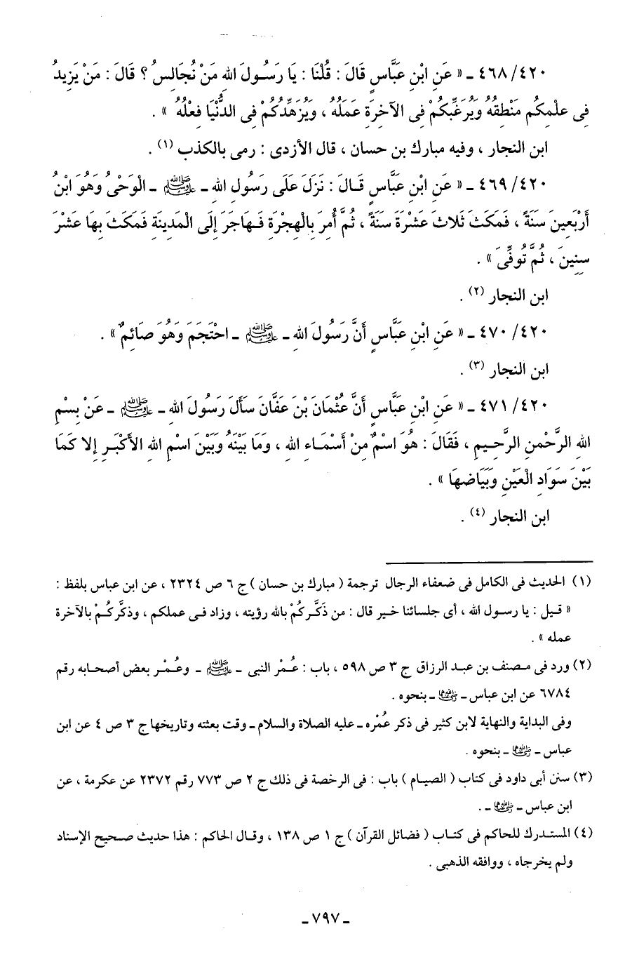 420/ 469 - "عَنِ ابْنِ عَبَّاسٍ قَالَ: نَزَلَ عَلَى رَسُولِ اللهِ - صلى الله عليه وسلم - الْوَحْيُ وَهُوَ ابْنُ أَرْبَعِينَ سَنَةً، فَمَكَثَ ثَلاثَ عَشْرَةَ سَنَةً، ثُمَّ أُمِرَ بِالْهِجْرَةِ فَهَاجَرَ إِلَى الْمَدِينَةِ فَمَكَثَ بِهَا عَشْرَ سِنِينَ، ثُمَّ تُوفِّيَ".