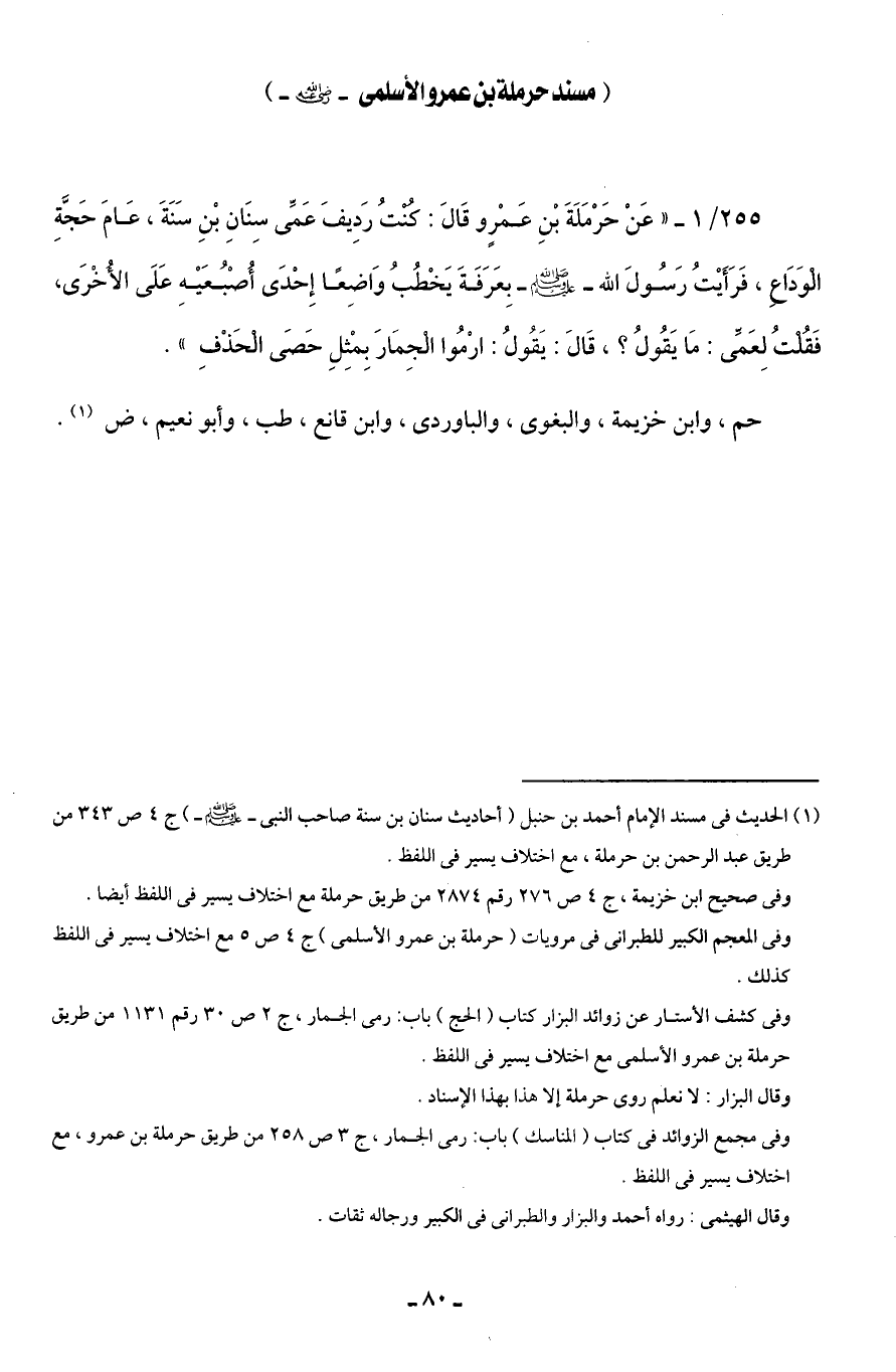 255/ 1 - " عَنْ حَرْمَلَةَ بْنِ عَمْرٍو قَالَ: كُنْتُ رَدِيفَ عَمِّى سِنَانِ بْنِ سَنَةَ، عَامَ حَجَّةِ الْوَدَاعِ، فَرَأَيْتُ رَسُولَ الله - صلى الله عليه وسلم - بِعَرَفَةَ يَخْطُبُ وَاضِعًا إِحْدَى أُصْبُعَيْهِ عَلَى الأُخْرَى، فَقُلْتُ لِعَمِّى: مَا يَقُولُ؟ ، قَالَ: يَقُولُ: ارْمُوا الْجِمَارَ بِمْثِلِ حَصَى الْحَذْفِ".