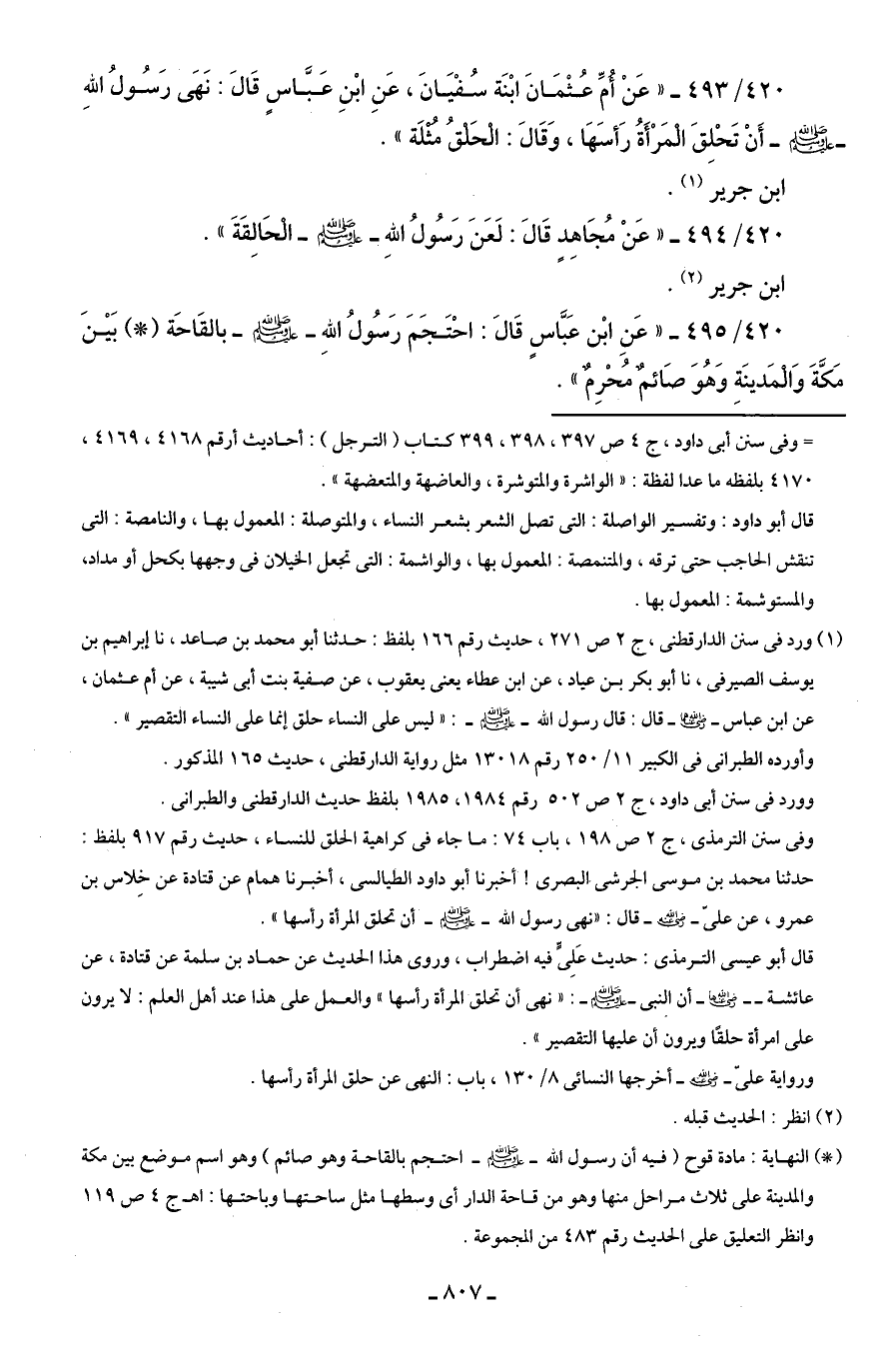420/ 493 - "عَنْ أُمِّ عُثْمَانَ ابْنَة سُفْيَانَ، عَنِ ابْنِ عَبَّاسٍ قَالَ: نَهَي رَسُولُ اللهِ - صلى الله عليه وسلم - أَنْ تَحْلِقَ الْمَرْأَةُ رَأسَهَا، وَقَالَ: الْحَلقُ مُثْلَة".