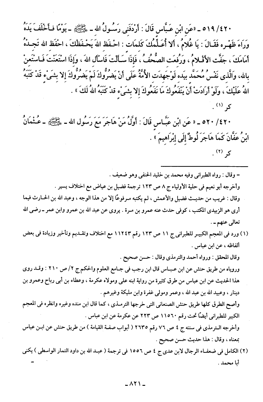 420/ 519 - "عَنِ ابْنِ عَبَّاسٍ قَالَ: أَرْدَفَنِى رَسُولُ اللهِ - صلى الله عليه وسلم - يَوْمًا فأَخْلَفَ يَدَهُ وَرَاءَ ظَهْره فَقَالَ: يَا غُلامُ، أَلا أُعَلِّمُكَ كلِمَاتٍ: احْفَظِ اللهَ يَحْفَظكَ، احْفَظِ الله تَجِدْهُ أَمَامَكَ، جَفَّت الأَقْلامُ، وَرفُعَتِ الصُّحُفُ، فَإِذَا سَأَلْتَ فَاسْأَلِ اللهَ، وَإِذَا اسْتَعَنْتَ فَاسْتَعِنْ بِالله، وَالَّذِى نَفْسُ مُحَمَّدٍ بيَدهِ لَوْجَهِدَتِ الأُمَّةُ عَلَى أَنْ يَضُرُّوكَ لَمْ يَضُرُّوكَ إِلا بِشَىْءٍ قَدْ كَتَبَهُ الله عَلَيْكَ، وَلَوْ أَرَادَتْ أَنْ يَنْفَعُوكَ مَا نَفَعُوكَ إِلا بِشَىْءٍ قدْ كَتَبَهُ الله لَكَ".