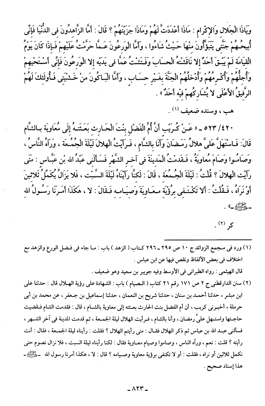 420/ 523 - "عَنْ كُرَيْب أَنَّ أُمَّ الْفَضْلِ بِنْتَ الْحَارِثِ بَعَثَتهُ إِلَى مُعَاويَة بالشَّام قَالَ: فَاسْتَهَلَّ عَلىَّ هِلالُ رَمَضَانَ وَأَنَا بِالشَّامِ، فَرَأَيْتُ الْهلالَ لَيْلَةَ الْجُمُعَة، وَرآهُ النَّاسُ، وَصَامُوا وَصَامَ مُعاويَةُ، فَقَدمْتُ الْمَدِينَةَ في آخِرِ الشَّهْرِ فَسَأَلَنِى عَبْدُ الله بْن عَبَّاسٍ: مَتَى رَأَيْت الْهلالَ؟ قُلْتُ: لَيْلَةَ الْجُمُعَةِ، قَالَ: لَكِنَّا رَأَيْنَاهُ لَيْلَةَ السَّبْت، فَلا يَزَالُ يُكَمِّلُ ثَلاثِينَ أَوْ نَرَاهُ، فَقُلتُ: أَلا تَكْتَفِى بِرُؤْيَةِ معَاوِيَةَ وَصِيَامِهِ فَقَالَ: لا، هَكَذَا أَمَرَنَا رَسُولُ اللهِ - صلى الله عليه وسلم - ".