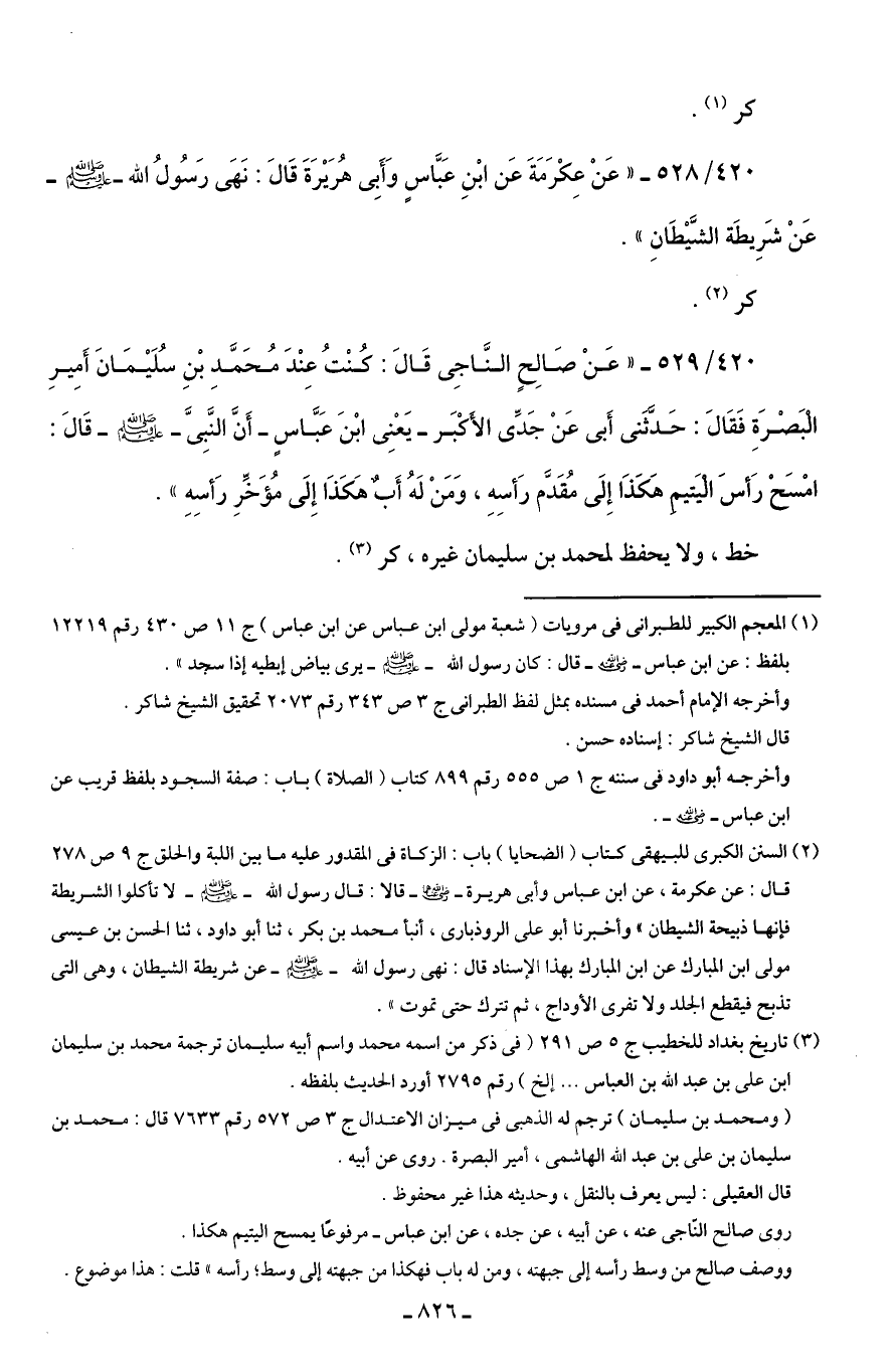 420/ 529 - "عَنْ صَالِحٍ النَّاجِى قَالَ: كُنْتُ عِنْدَ مُحَمَّدِ بْنِ سُلَيْمَانَ أَمِيرِ الْبَصْرَةِ فَقَالَ: حَدَّثَنى أَبى عَنْ جَدِّى الأَكْبَر - يَعْنِى ابْنَ عَبَّاسٍ - أَنَّ النَّبِىَّ - صلى الله عليه وسلم - قَالَ: امْسَحْ رَأسَ الْيَتيم هَكَذَا إِلَى مُقَدَّم رَأسِهِ، وَمَنْ لَهُ أَبٌ هَكَذَا إِلَى مُؤَخِّرِ رَأسِهِ".