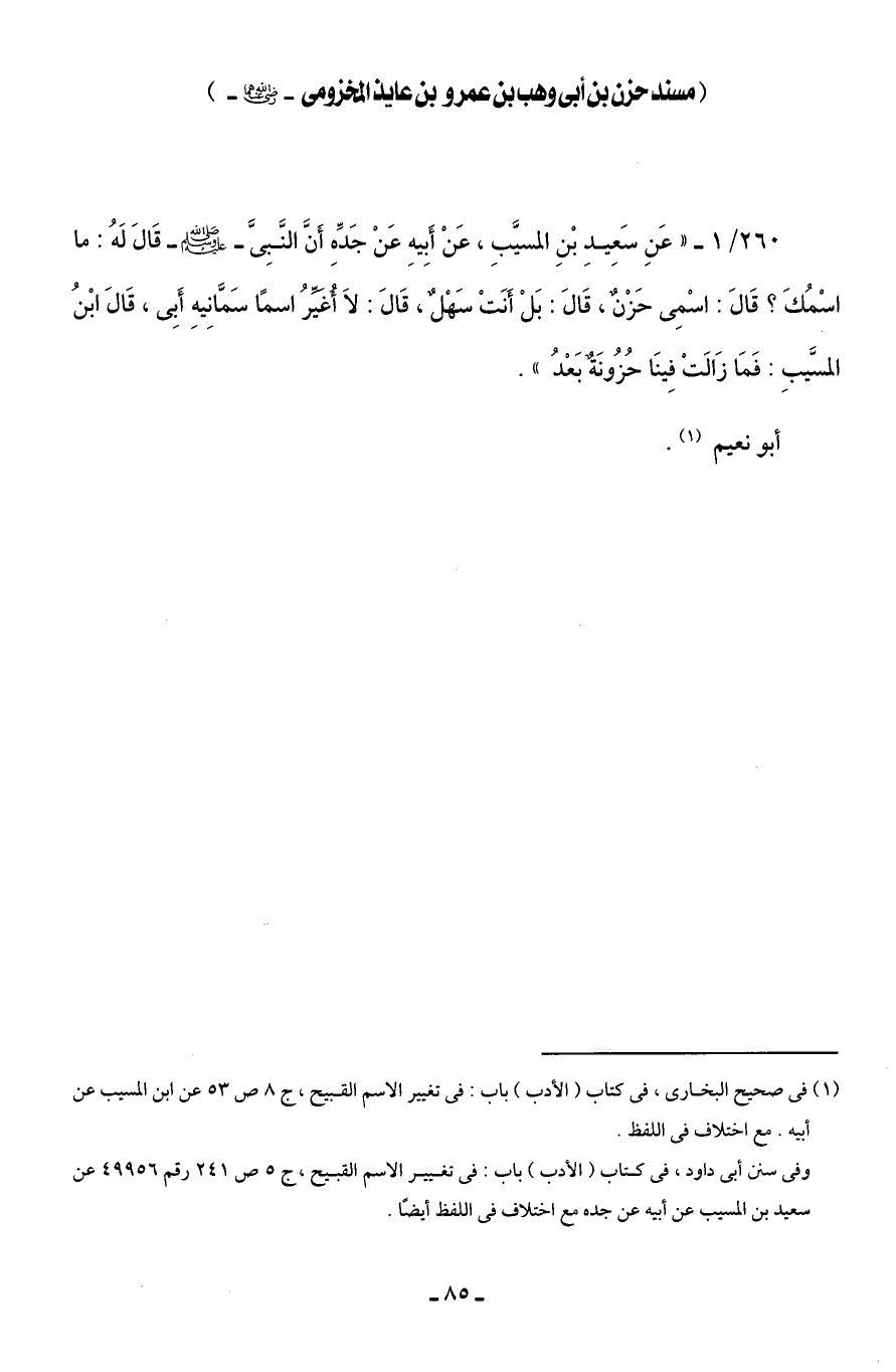 260/ 1 - " عَنِ سَعِيدِ بْنِ المسيَّبِ، عَنْ أَبِيهِ عَنْ جَدِّهِ أَنَّ النَّبِىَّ - صلى الله عليه وسلم - قَالَ لَهُ: ما اسْمُكَ؟ قَالَ: اسْمِى حَزْنٌ، قَالَ: بَلْ أَنَتْ سَهْلٌ، قَالَ: لَا أُغَيِّرُ اسمًا سَمَّانِيهِ أَبِى، قَالَ ابْنُ المسيَّبِ: فَمَا زَالَتْ فِينَا حُزُونَةٌ بَعْدُ".