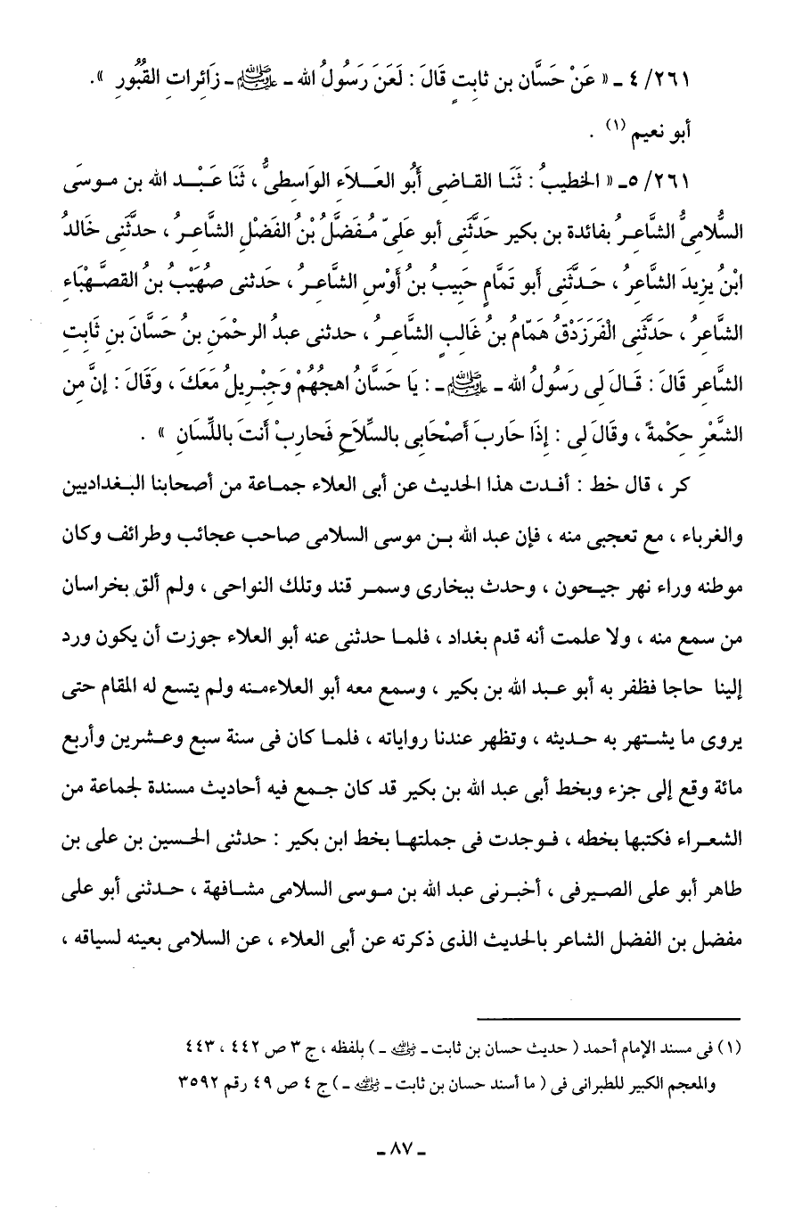 261/ 5 - "الخطيبُ: ثَنَا القاضِى أَبُو العَلَاءِ الوَاسِطىُّ، ثَنَا عَبْد الله بن موسَى السُّلامِىُّ الشَّاعِرُ بفائدة بن بكير حَدَّثَنِى أبو عَلِىّ مُفَضَّلُ بْنُ الفَضْلِ الشَّاعِرُ، حدَّثَنِى خَالدُ بْنُ يزِيدَ الشَّاعِرُ، حَدَّثَنِى أَبو تَمَّامٍ حَبِيبُ بنُ أَوْسِ الشَّاعِرُ، حَدثنى صُهَيْبُ بنُ القصَّهْبَاءِ الشَّاعِرُ، حَدَّثنى الفَرَزْدَقُ هَمّامُ بنُ غَالِبٍ الشَّاعِرُ، حدثني عبدُ الرَّحْمَنِ بنُ حَسَّانَ بنِ ثَابِتِ الشَّاعِر قَالَ: قَالَ لِى رَسُولُ الله - صلى الله عليه وسلم -: يَا حَسَّانُ اهجُهُمْ وَجِبْرِيلُ مَعَكَ، وَقَالَ: إنَّ مِن الشَّعْرِ حِكْمةً، وقَالَ لِى: إِذَا حَاربَ أَصْحَابِى بالسِّلَاحِ فَحارِبْ أَنتَ باللِّسَانِ".