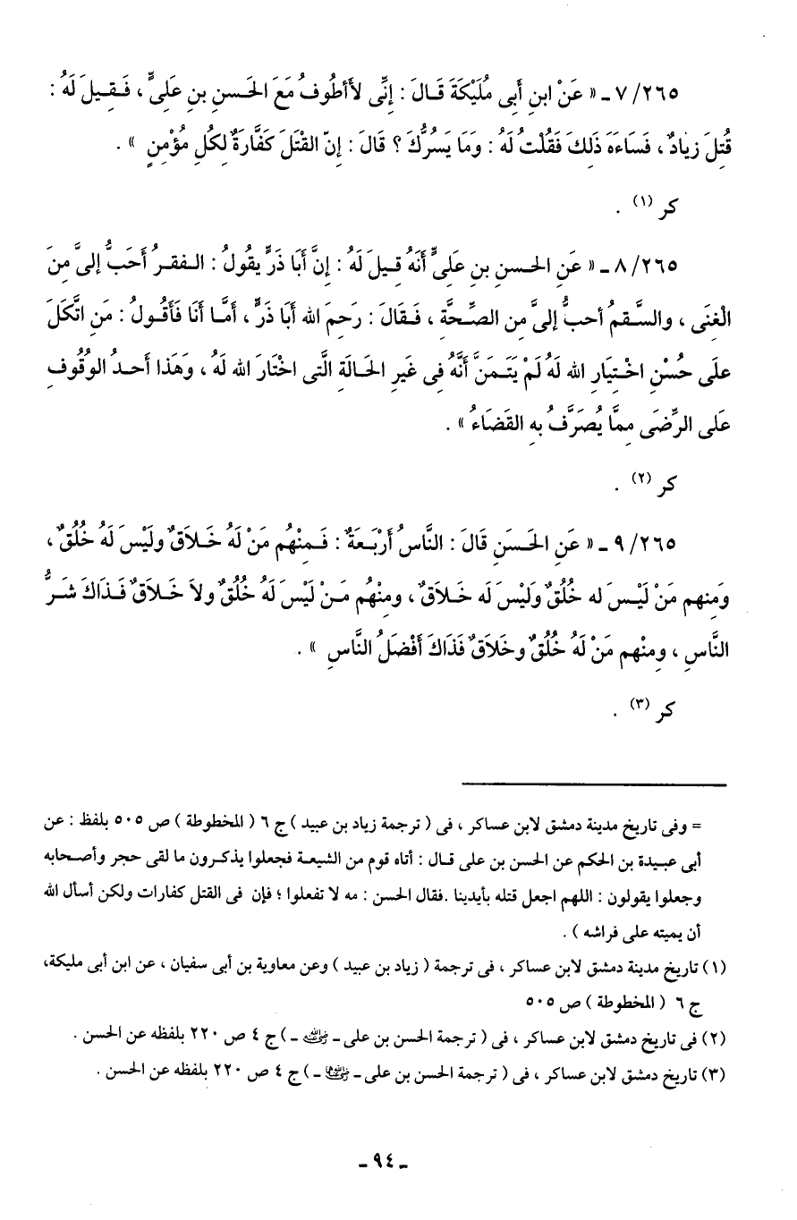 265/ 7 - "عَنْ ابنِ أَبِى مُلَيْكَةَ قَالَ: إِنِّى لأَطُوفُ مَعَ الحَسنِ بنِ عَلِىٍّ، فَقِيلَ لَهُ: قُتِلَ زيادٌ، فَسَاءَهَ ذَلِكَ فَقُلْتُ لَهُ: وَمَا يَسُرُّكَ؟ قَالَ: إِنّ القَتْلَ كَفَّارَةٌ لِكُلِ مُؤْمِنٍ".