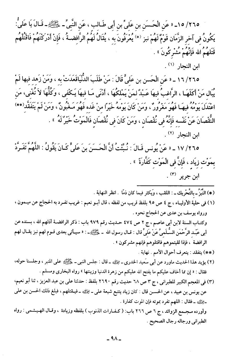 265/ 15 - "عَنِ الْحَسَنِ بنِ عَلِىِّ بنِ أَبِى طَالِبٍ، عَنِ النَّبِىَّ - صلى الله عليه وسلم - قَالَ يَا عَلىُّ: يَكُونُ فِى آخِرِ الزَّمَان قَوْمٌ لَهُمْ نبز (*) يُعْرَفُونَ بِهِ، يُقَالُ لَهُمُ الرَّافِضةُ، فَإِنْ أَدْرَكْتَهُمْ فَاقْتُلْهُم قَتَلهُمُ الله فَإنَّهُمْ مُشْرِكُونَ".