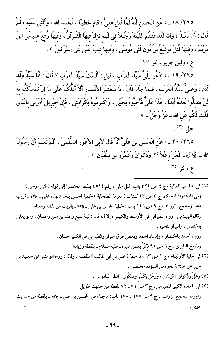 265/ 20 - "عَنِ الْحَسَن بن عَلىًّ أَنَّهُ قَالَ لأَبِى الأَعَور السُّلَمىِّ، أَلَمْ تَعْلَمْ أَنَّ رَسُولَ الله - صلى الله عليه وسلم - لَعَنَ رِعْلًا (*) وَذَكْوانَ وَعَمْرَو بن سُفْيَان".