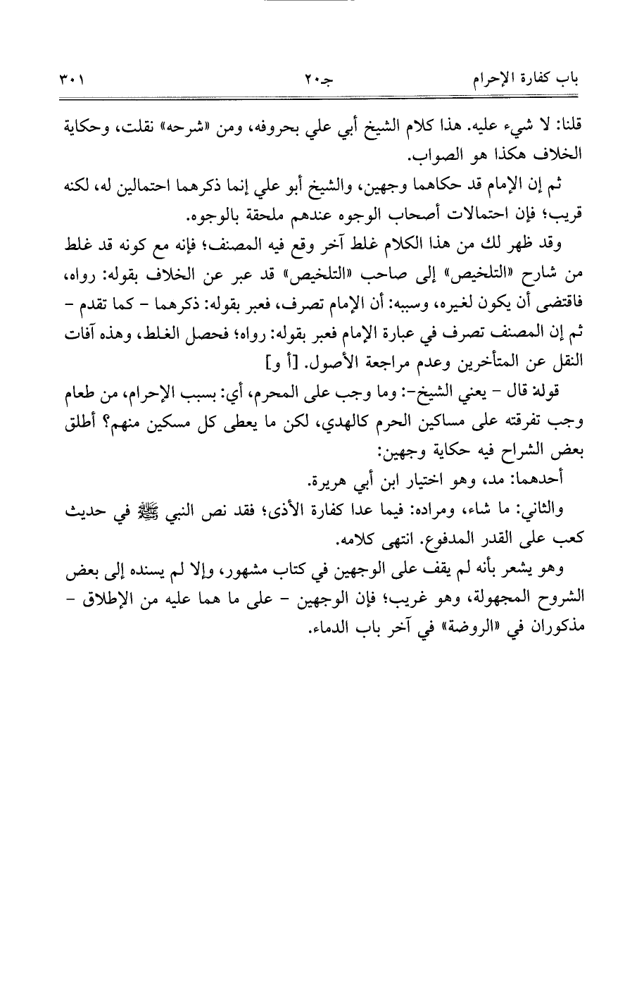 قلنا: لا شيء عليه. هذا كلام الشيخ أبي علي بحروفه، ومن ((شرحه)) نقلت، وحكاية الخلاف هكذا هو الصواب.