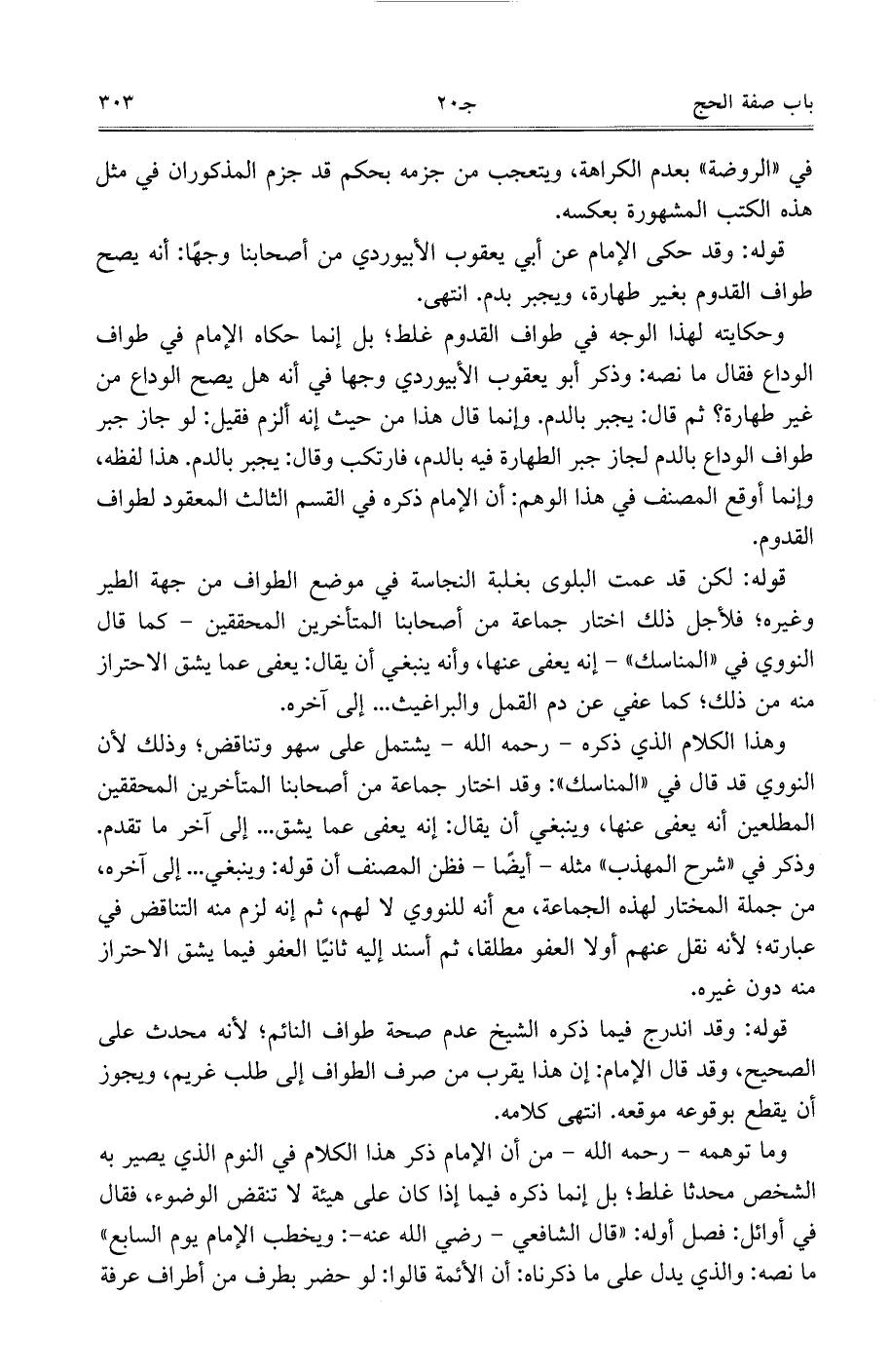 قوله: لكن قد عمت البلوى بغلبة النجاسة في موضع الطواف من جهة الطير وغيره، فلأجل ذلك اختار جماعة من أصحابنا المتأخرين المحققين- كما قال النووي في ((المناسك)) - إنه يعفى عنها، وأنه ينبغي أن يقال: يعفى عما يشق الاحتراز منه من ذلك، كما عفي عن دم القمل والبراغيث ... إلى آخره.