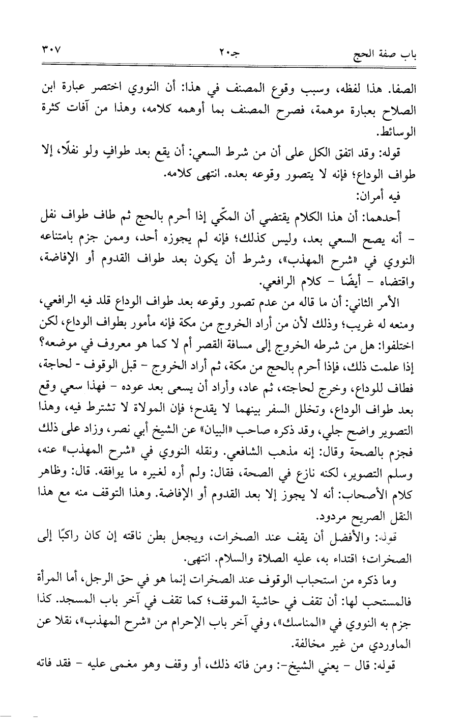 الأمر الثاني: أن ما قاله من عدم تصور وقوعه بعد طواف الوداع قلد فيه الرافعي، ومنعه له غريب، وذلك لأن من أراد الخروج من مكة فإنه مأمور بطواف الوداع، لكن اختلفوا: هل من شرطه الخروج إلى مسافة القصر أم لا كما هو معروف في موضعه؟ إذا علمت ذلك، فإذا أحرم بالحج من مكة، ثم أراد الخروج- قبل الوقوف- لحاجة، فطاف للوداع، وخرج لحاجته، ثم عاد، وأراد أن يسعى بعد عوده- فهذا سعي وقع بعد طواف الوداع، وتخلل السفر بينهما لا يقدح، فإن المولاة لا تشترط فيه، وهذا التصوير واضح جلي، وقد ذكره صاحب ((البيان)) عن الشيخ أبي نصر، وزاد على ذلك فجزم بالصحة وقال: إنه مذهب الشافعي. ونقله النووي في ((شرح المهذب)) عنه، وسلم التصوير، لكنه نازع في الصحة، فقال: ولم أره لغيره ما يوافقه. قال: وظاهر كلام الأصحاب: أنه لا يجوز إلا بعد القدم أو الإضافة. وهذا التوقف منه مع هذا النقل الصريح مردود.