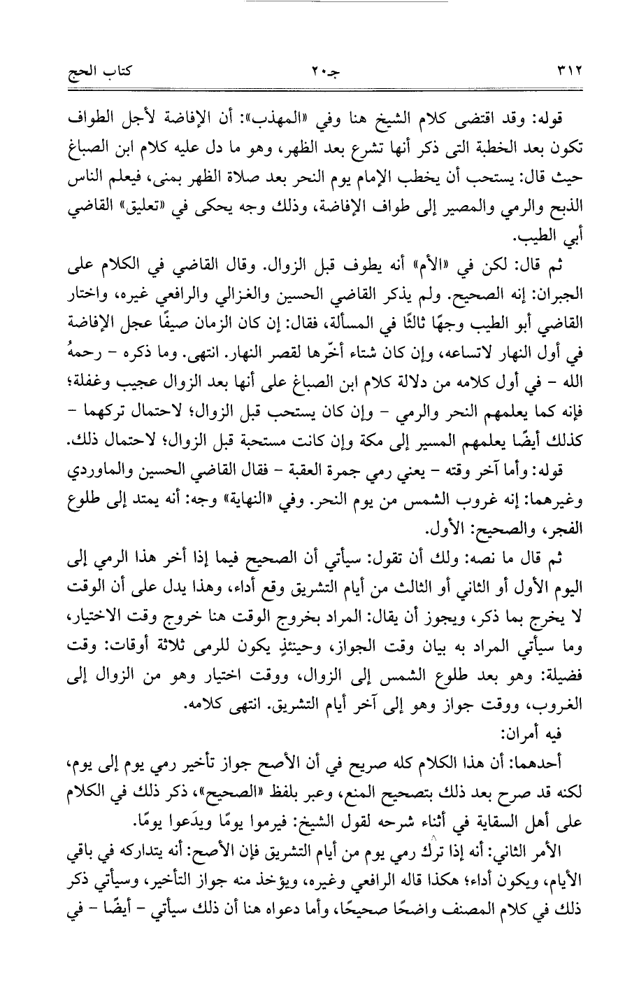 قوله: وقد اقتضى كلام الشيخ هنا وفي ((المهذب)): أن الإفاضة لأجل الطواف تكون بعد الخطبة التي ذكر أنها تشرع بعد الظهر، وهو ما دل عليه كلام ابن الصباغ حيث قال: يستحب أن يخطب الإمام يوم النحر بعد صلاة بمنى، فيعلم الناس الذبح والرمي والمصير إلى طواف الإفاضة، وذلك وجه يحكى في ((تعليق)) القاضي أبي الطيب.