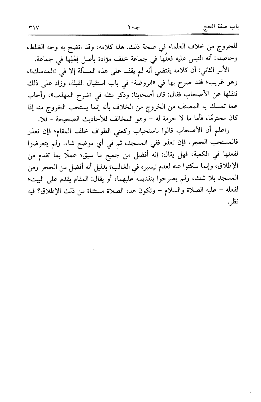 الأمر الثاني: أن كلامه يقتضي أنه لم يقف على هذه المسألة إلا في ((المناسك))، وهو غريب، فقد صرح بها في ((الروضة)) في باب استقبال القبلة، وزاد على ذلك فنقلها عن الأصحاب فقال: قال أصحابنا: وذكر مثله في ((شرح المهذب))، وأجاب عما تمسك به المصنف من الخروج من الخلاف بأنه إنما يستحب الخروج منه إذا كان محترمًا، فأما ما لا حرمة له- وهو المخالف للأحاديث الصحيحة- فلا.