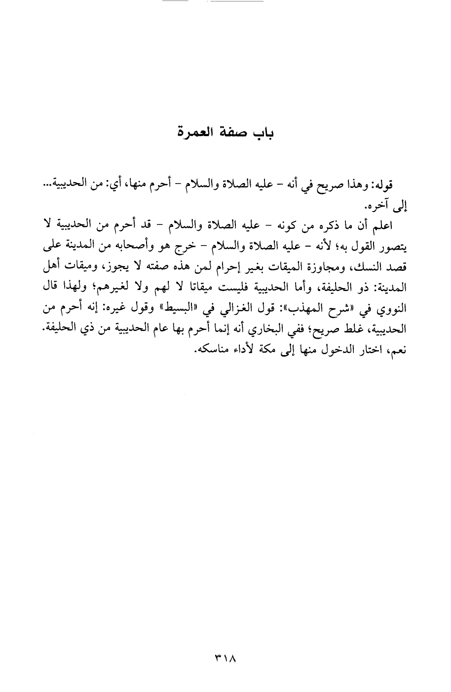 اعلم أن ما ذكره من كونه- عليه الصلاة والسلام- قد أحرم من الحديبية لا يتصور القول به، لأنه- عليه الصلاة والسلام- خرج هو وأصحابه من المدينة على قصد النسك، ومجاوزة الميقات بغير إحرام لمن هذه صفته لا يجوز، وميقات أهل المدينة: ذو الحليفة، وأما الحديبية فليست ميقاتا لا لهم ولا لغيرهم، ولهذا قال النووي في ((شرح المهذب)): قول الغزالي في ((البسيط)) وقول غيره: إنه أحرم من الحديبية، غلط صريح، ففي البخاري أنه إنما أحرم بها عام الحديبية من ذي الحليفة. نعم، اختار الدخول منها إلى مكة لأداء مناسكه.
