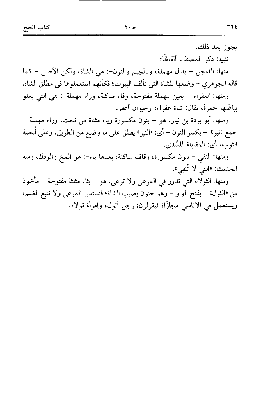 منها: الداجن- بدال مهملة، وبالجيم والنون-: هي الشاة، ولكن الأصل- كما قاله الجوهري- وضعها للشاة التي تألف بالبيوت، فكأنهم استعملوها في مطلق الشاة.
