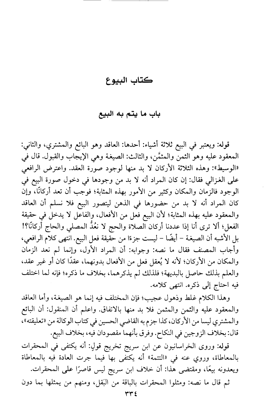 قوله: ويعتبر في البيع ثلاثة أشياء: أحدها: العاقد وهو البائع والمشتري، والثاني: المعقود عليه وهو الثمن والمثمن، والثالث: الصيغة وهي الإيجاب والقبول. قال في ((الوسيط)): وهذه الثلاثة الأركان لابد منها لوجود صورة العقد. واعترض الرافعي على الغزالي فقال: إن كان المراد أنه لابد من وجودها في دخول صورة البيع في الوجود فالزمان والمكان وكثير من الأمور بهذه المثابة، فوجب أن تعد أركانًا، وإن كان المراد أنه لابد من حضورها في الذهن ليتصور البيع فلا نسلم أن العاقد والمعقود عليه بهذه المثابة، لأن البيع فعل من الأفعال، والفاعل لا يدخل في حقيقة الفعل، ألا ترى أنا إذا عددنا أركان الصلاة والحج لا نعد المصلي والحاج أركانًا؟! بل الأشبه أن الصيغة- أيضًا- ليست جزءًا من حقيقة فعل البيع. انتهى كلام الرافعي، وأجاب المصنف فقال ما نصه: وجوابه: أن المراد الأول، وإنما لم نعد الزمان والمكان من الأركان، لأنه لا يعقل فعل من الأفعال بدونهما، عقدًا كان أو غير عقد، والعلم بذلك حاصل بالبديهة، فلذلك لم يذكرهما، بخلاف ما ذكره، فإنه لما اختلف فيه احتاج إلى ذكره. انتهى كلامه.