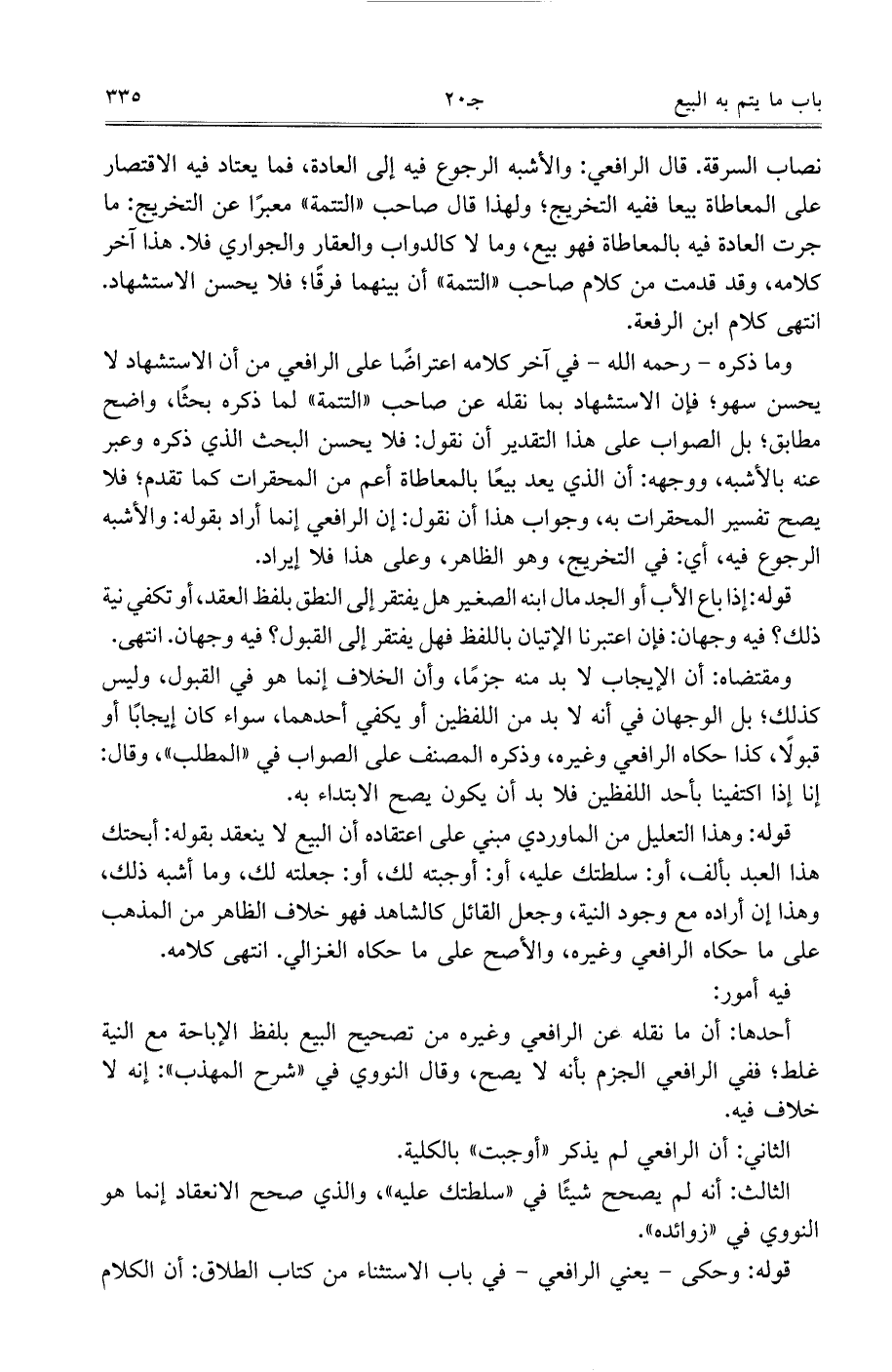 وما ذكره- رحمه الله- في آخر كلامه اعتراضًا على الرافعي من أن الاستشهاد لا يحسن سهو، فإن الاستشهاد بما نقله عن صاحب ((التتمة)) لما ذكره بحثًا، واضح مطابق، بل الصواب على هذا التقدير أن نقول: فلا يحسن البحث الذي ذكره وعبر عنه بالأشبه، ووجهه: أن الذي يعد بيعًا بالمعاطاة أعم من المحقرات كما تقدم، فلا يصح تفسير المحقرات به، وجواب هذا أن نقول: إن الرافعي إنما أراد بقوله: والأشبه الرجوع فيه، أي: في التخريج، وهو الظاهر، وعلى هذا فلا إيراد.