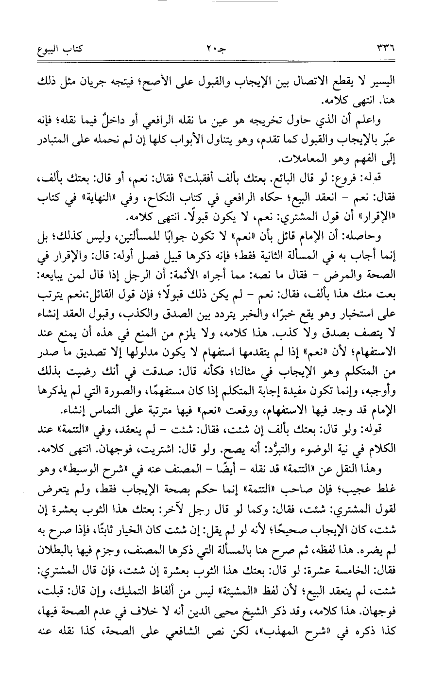 وحاصله: أن الإمام قائل بأن ((نعم)) لا تكون جوابًا للمسألتين، وليس كذلك، بل إنما أجاب به في المسألة الثانية فقط، فإنه ذكرها قبيل فصل أوله: قال: والإقرار في الصحة والمرض- فقال ما نصه: مما أجراه الأئمة: أن الرجل إذا قال لمن يبايعه: بعت منك هذا بألف، فقال: نعم- لم يكن ذلك قبولًا، فإن قول القائل: نعم يترتب على استخبار وهو يقع خبرًا، والخبر يتردد بين الصدق والكذب، وقبول العقد إنشاء لا يتصف بصدق ولا كذب. هذا كلامه، ولا يلزم من المنع في هذه أن يمنع عند الاستفهام، لأن ((نعم)) إذا لم يتقدمها استفهام لا يكون مدلولها إلا تصديق ما صدر من المتكلم وهو الإيجاب في مثالنا، فكأنه قال: صدقت في أنك رضيت بذلك وأوجبه، وإنما تكون مفيدة إجابة المتكلم إذا كان مستفهمًا، والصورة التي لم يذكرها الإمام قد وجد فيها الاستفهام، ووقعت ((نعم)) فيها مترتبة على التماس إنشاء.
