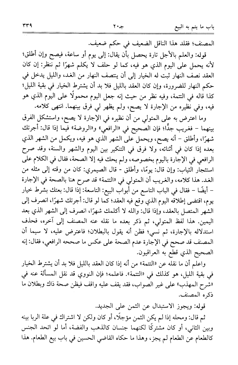 قوله: والعلم بالأجل تارة يحصل بأن يقال: إلى يوم أو ساعة، فيصح وإن أطلق، لأنه يحمل على اليوم الذي هو فيه، كما لو حلف لا يكلم شهرًا ثم ينظر: إن كان العقد نصف النهار ثبت له الخيار إلى أن ينتصف النهار من الغد، والليل يدخل في حكم النهار للضرورة، وإن كان العقد بالليل فلابد أن يشترط الخيار في بقية الليل، كذا قاله في التتمة، وفيه نظر من حيث إنه جعل اليوم محمولًا على اليوم الذي هو فيه، وفي نظيره من الإجارة لا يصح، ولم يظهر لي فرق بينهما. انتهى كلامه.