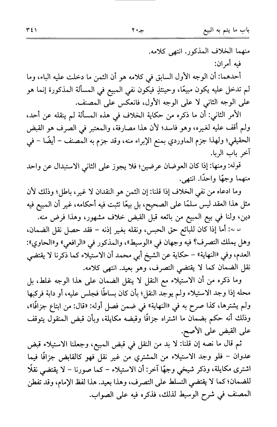 قوله: أما إذا كان للبائع حق الحبس، ونقله بغير إذنه- فقد حصل نقل الضمان، وهل يملك التصرف؟ فيه وجهان في ((الوسيط))، والمذكور في ((الرافعي)) و ((الحاوي)): العدم، وفي ((النهاية)) - حكاية عن الشيخ أبي محمد أن الاستيلاء كما ذكرنا لا يقتضي نقل الضمان كما لا يقتضي التصرف، وهو بعيد. انتهى كلامه.