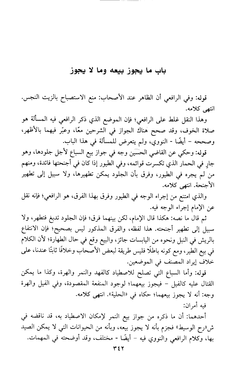 ثم قال ما نصه: هكذا قال الإمام، لكن بينهما فرق، فإن الجلود تدبغ فتطهر، ولا سبيل إلى تطهير أجنحته. هذا لفظه، والفرق المذكور ليس بصحيح، فإن الانتفاع بالريش في النبل ونحوه من اليابسات جائز، والبيع وقع في حال الطهارة، لأن الكلام في بيع الطير، ومع كونه باطلًا فليس طريقة لبعض الأصحاب وخلافًا ثابتًا عندنا، على خلاف إيراد المصنف في الموضعين.
