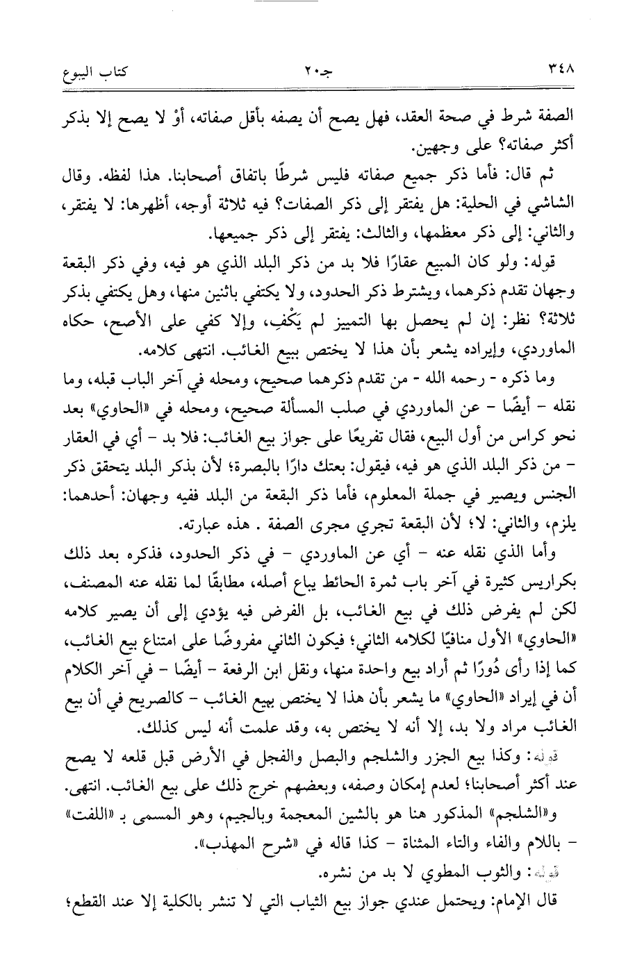 وما ذكره- رحمه الله- من تقدم ذكرهما صحيح، ومحله في آخر الباب قبله، وما نقله أيضًا- عن الماوردي في صلب المسألة صحيح، ومحله في ((الحاوي)) بعد نحو كراس من أول البيع، فقال تفريعًا على جواز بيع الغائب: فلابد- أي في العقار- من ذكر البلد الذي هو فيه، فيقول: بعتك دارًا بالبصرة، لأن بذكر البلد يتحقق ذكر الجنس ويصير في جملة المعلوم، فأما ذكر البقعة من البلد ففيه وجهان: أحدهما: يلزم، والثاني: لا، لأن البقعة تجري مجرى الصفة. هذه عبارته.