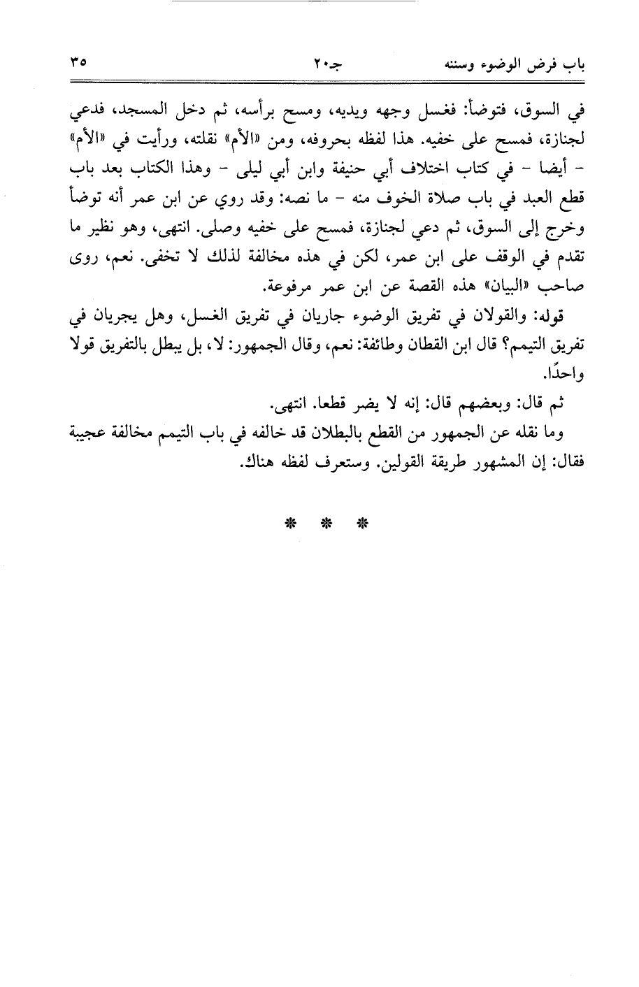 في السوق، فتوضأ: فغسل وجهه ويديه، ومسح برأسه، ثم دخل المسجد، فدعي لجنازة، فمسح على خفيه. هذا لفظه بحروفه، ومن ((الأم)) نقلته، ورأيت في ((الأم)) - أيضًا- في كتاب اختلاف أبي حنيفة وابن أبي ليلى- وهذا الكتاب بعد باب قطع العبد في باب صلاة الخوف منه- ما نصه: وقد روي عن ابن عمر أنه توضأ وخرج إلى السوق، ثم دعي لجنازة، فمسح على خفيه وصلى. انتهى، وهو نظير ما تقدم في الوقف على ابن عمر، لكن في هذه مخالفة لذلك لا تخفي. نعم، روى صاحب ((البيان)) هذه القصة عن ابن عمر مرفوعة.