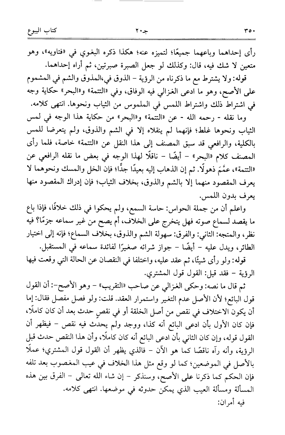 ثم قال ما نصه: وحكى الغزالي عن صاحب ((التقريب)) - وهو الأصح-: أن القول قول البائع، لأن الأصل عدم التغير واستمرار العقد. قلت: ولو فصل مفصل فقال: إما أن يكون الاختلاف في نقص أصل الخلقة أو في نقصٍ حدث بعد أن كان كاملًا، فإن كان الأول بأن ادعى البائع أنه كذا، ووجد ولم يحدث فيه نقص- فيظهر أن القول قوله، وإن كان الثاني بأن ادعى البائع أنه كان كاملًا، وأن هذا النقص حدث قبل الرؤية، وأنه رآه ناقصًا كما هو الآن- فالذي يظهر أن القول قول المشتري، عملًا بالأصل في الموضعين، كما لو وقع مثل هذا الخلاف في عيب المغضوب بعد تلفه فإن الحكم كما ذكرنا على الأصح، وسنذكر- إن شاء الله تعالى- الفرق بين هذه المسألة ومسألة العيب الذي يمكن حدوثه في موضعها. انتهى كلامه.
