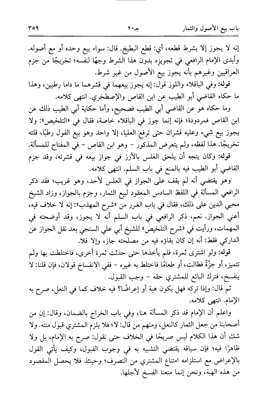 إنه لا يجوز إلا بشرط قطعه، أي: قطع البطيخ. قال: سواء بيع وحده أو مع أصوله. وأبدى الإمام الرافعي في تجويزه بدون هذا الشرط وجهًا لنفسه، تخريجًا من جزم العراقيين وغيرهم بأنه يجوز بيع الأصول من غير شرط.