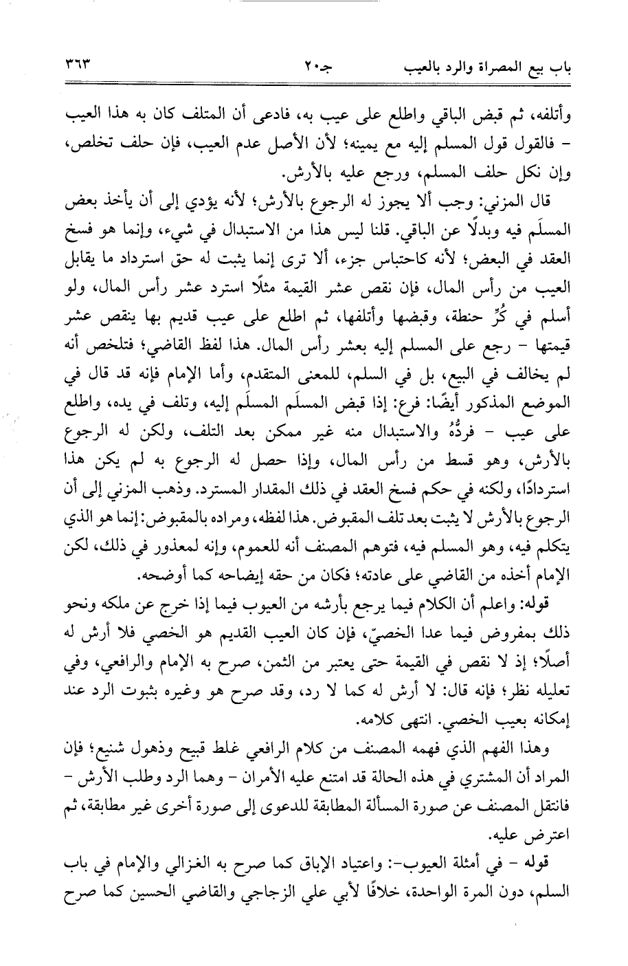 قال المزني: وجب ألا يجز له الرجوع بالأرش، لأنه يؤدي إلى أن يأخذ بعض المسلم فيه وبدلًا عن الباقي. قلنا ليس هذا من الاستبدال في شيء، وإنما هو فسخ العقد في البعض، لأنه كاحتباس جزء، ألا ترى إنما يثبت له حق استرداد ما يقابل العيب من رأس المال، فإن نقص عشر القيمة مثلًا استرد عشر رأس المال، ولو أسلم في كر حنطة، وقبضها وأتلفها، ثم اطلع على عيب قديم بها ينقص عشر قيمتها- رجع على المسلم إليه بعشر رأس المال. هذا لفظ القاضي، فتلخص أنه لم يخالف في البيع، بل في السلم، للمعنى المتقدم، وأما الإمام فإنه قد قال في الموضع المذكور أيضًا: فرع: إذا قبض المسلم المسلم إليه، وتلف في يده، واطلع على عيب- فرده والاستبدال منه غير ممكن بعد التلف، ولكن له الرجوع بالأرش، وهو قسط من رأس المال، وإذا حصل له الرجوع به لم يكن هذا استردادًا، ولكنه في حكم فسخ العقد في ذلك المقدار المسترد. وذهب المزني إلى أن الرجوع بالأرش لا يثبت بعد تلف المقبوض. هذا لفظه، ومراده بالمقبوض: إنما هو الذي يتكلم فيه، وهو المسلم فيه، فتوهم المصنف أنه للعموم، وإنه لمعذور في ذلك، لكن الإمام أخذه من القاضي على عادته، فكان من حقه إيضاحه كما أوضحه.